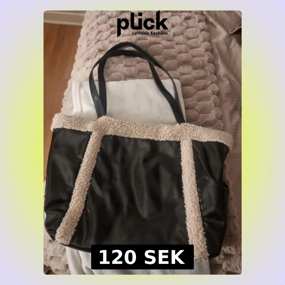 svart lite större väska med mjuka teddy-detaljer i beige längs kanterna. Väskan har svarta handtag i syntetmaterial och dragkedja upptill. Insidan är rymlig med flera fack för småsaker. Perfekt för dig som vill ha praktisk väska.