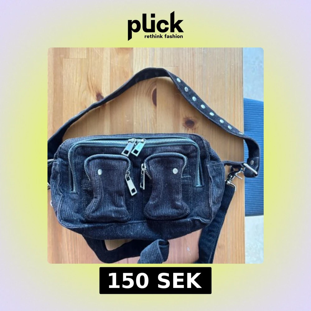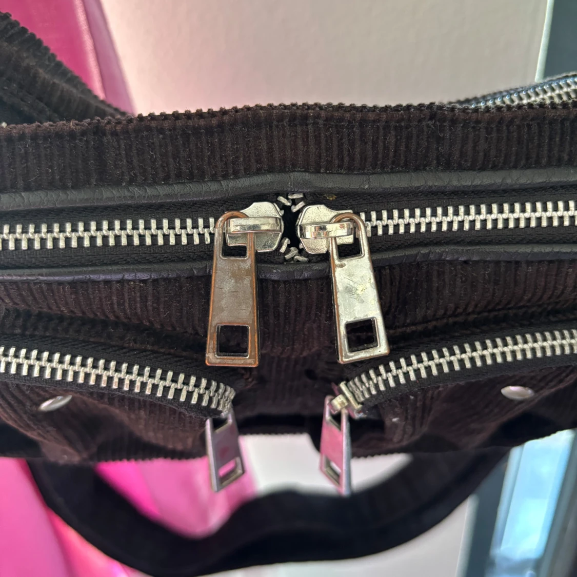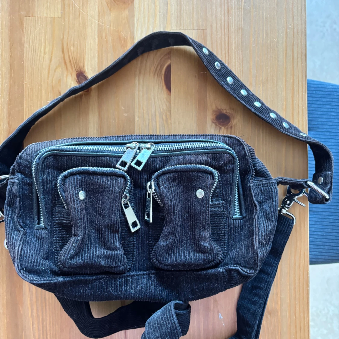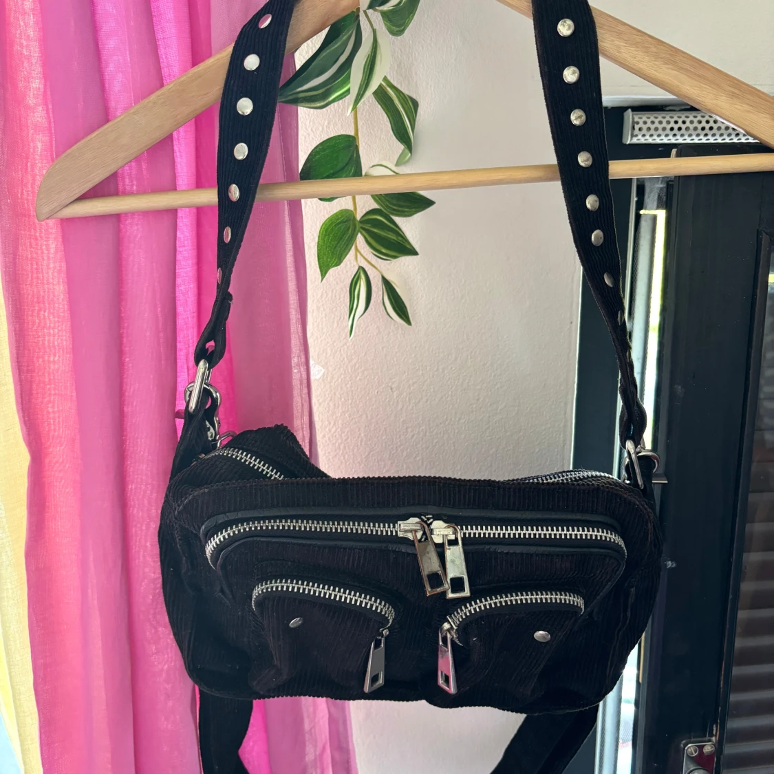 Cool svart axelväska i manchestertyg med flera silvriga dragkedjor och nitar på axelbandet. Väskan har två mindre fickor framtill och justerbart axelband. Perfekt för att bära dina viktigaste saker med stil.