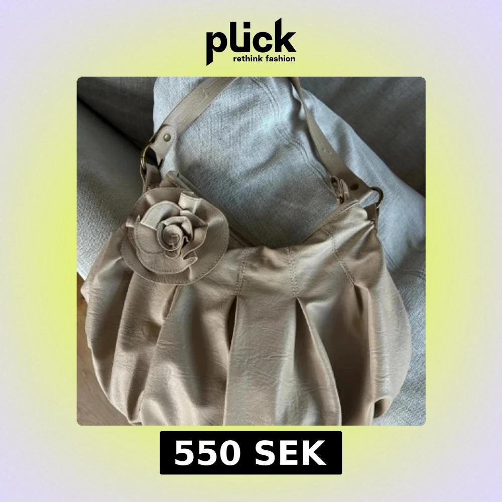 Säljer en beige axelväska i skinn med dekorativ rosdetalj framtill. Väskan har veckad design och justerbar axelrem i samma material. Perfekt för dig som vill ha en stilren men unik accessoar. Liten fläck på rosen