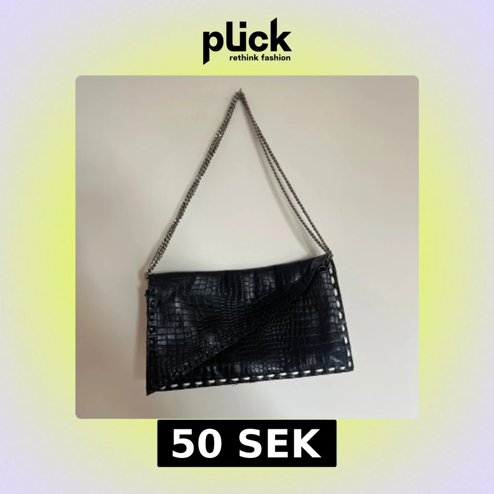 Stilren svart kuvertväska i croco-mönstrat skinnimitation med silverfärgad kedjerem. Väskan har ett kuvertformat lock och dekorativa sömmar längs kanterna. Perfekt för att lyfta vilken outfit som helst.