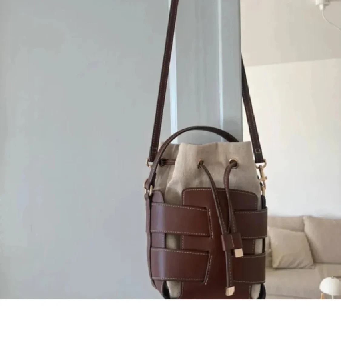Snygg axelväska i bucket-modell med brunt skinn och beige canvas. Väskan har justerbar axelrem, cool snörning upptill och detaljer i guld. Perfekt storlek för det viktigaste och ger en trendig touch till din outfit.