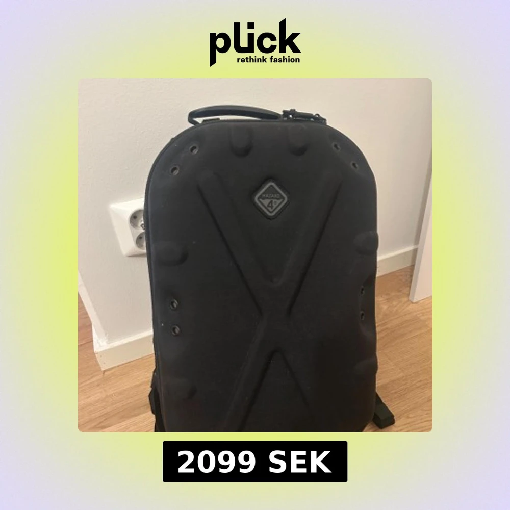 Säljer en svart ryggsäck från Hazard 4 med hård, formpressad framsida och coola detaljer. Ryggsäcken har flera fästen, justerbara remmar och vadderad baksida för extra komfort. Perfekt för dig som gillar funktionell och stilren design.