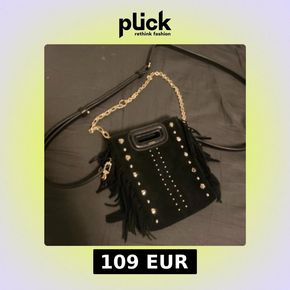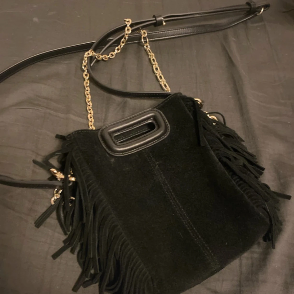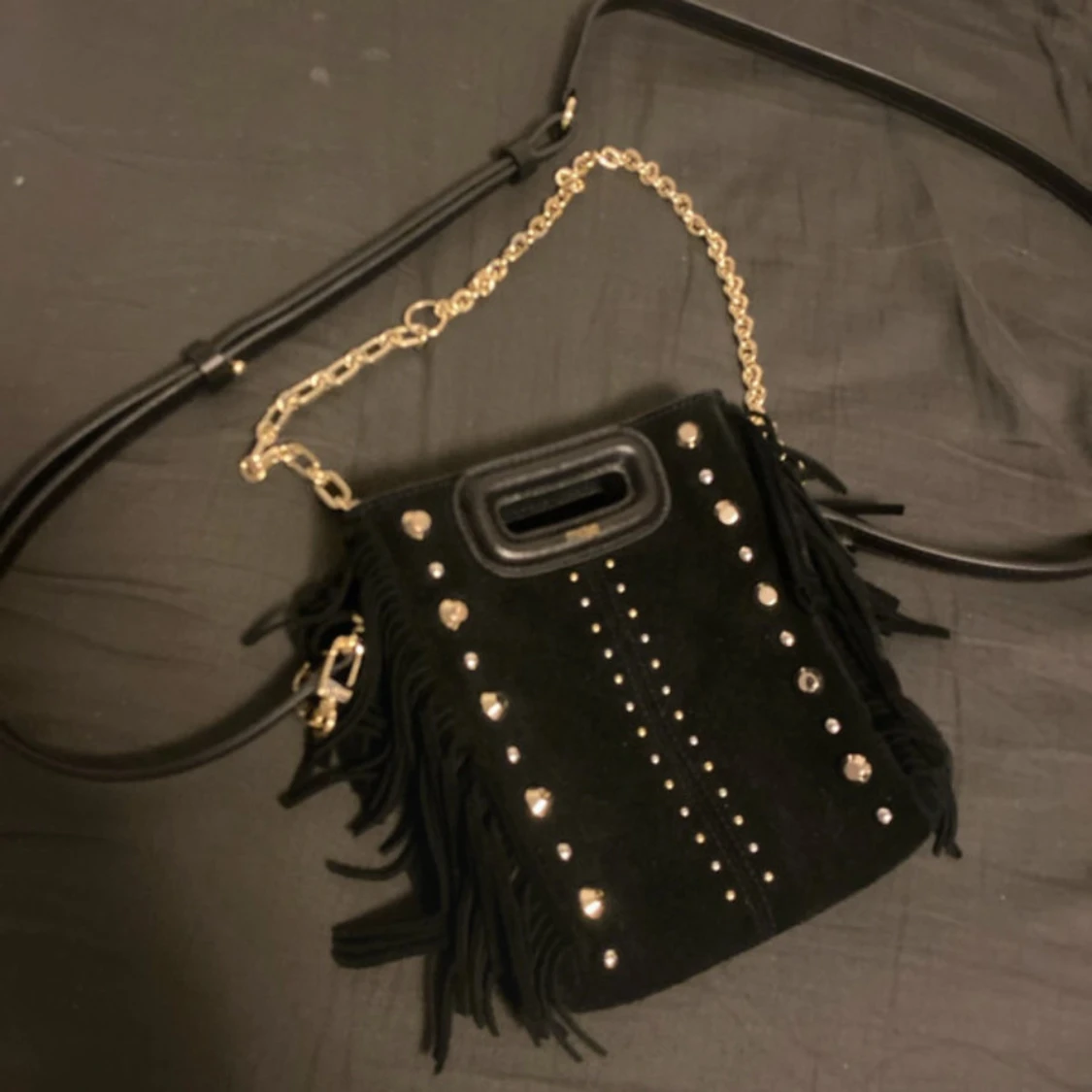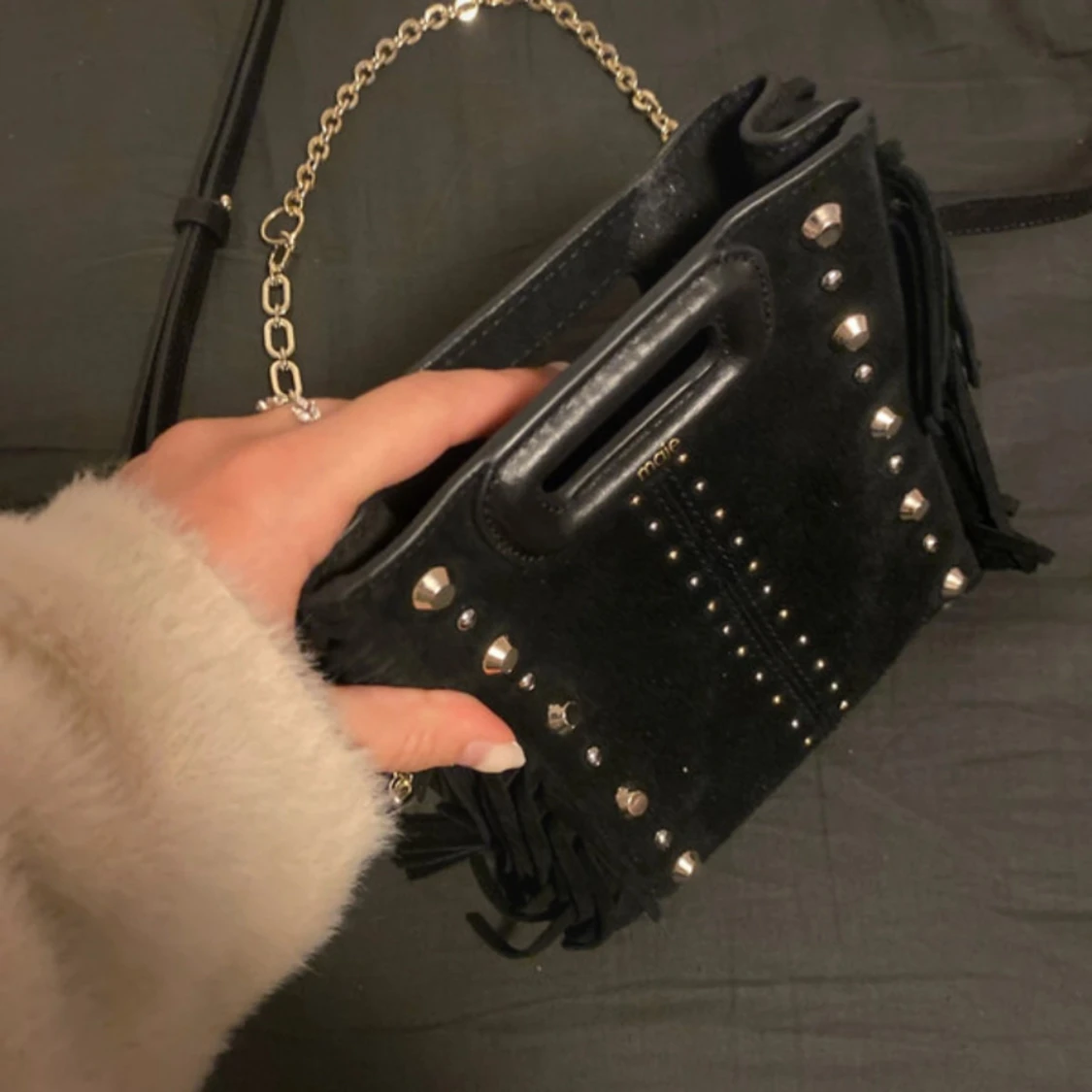 Snygg svart axelväska från Maje i mocka med fransar på sidorna och silverfärgade nitar framtill. Väskan har både axelrem i läder och en kedja i guld, samt ett praktiskt handtag upptill. Perfekt för dig som vill sticka ut med coola detaljer.