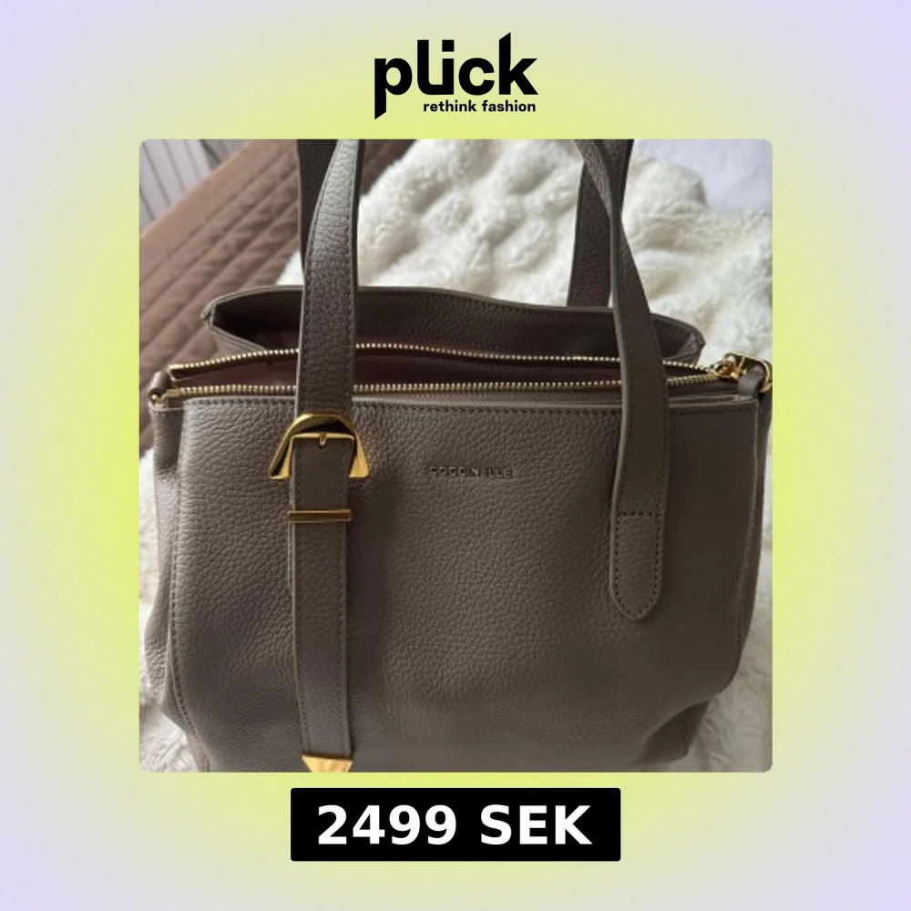 Snygg beige handväska från Coccinelle i mjukt, kornigt skinn med guldfärgade metalldetaljer och dubbla handtag. Väskan har dragkedja upptill och stilren design med diskret logga framtill. Perfekt storlek för vardagens essentials.