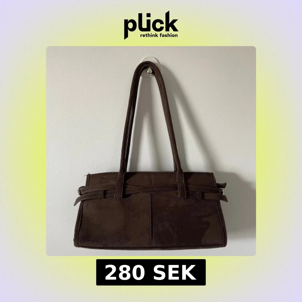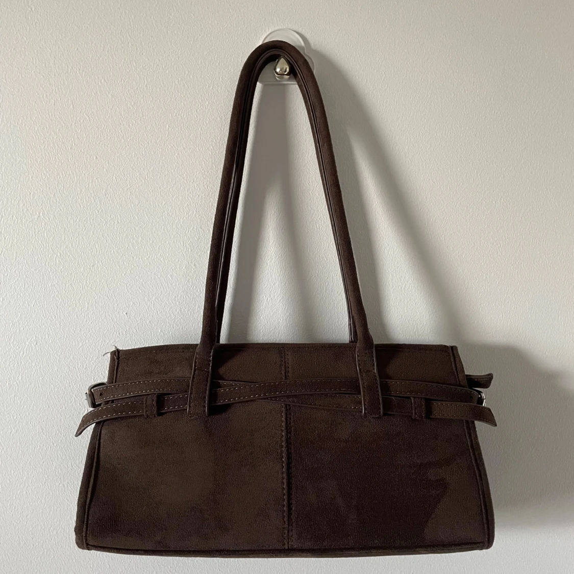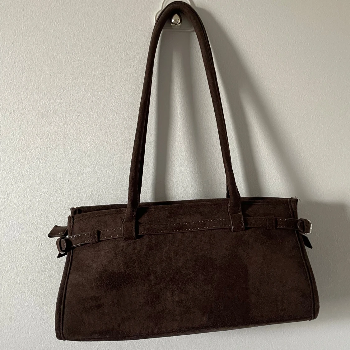 Stilren brun axelväska i mocka med långa handtag och snygga bältdetaljer på sidorna. Använd 2 gånger. Prisen kan diskuteras