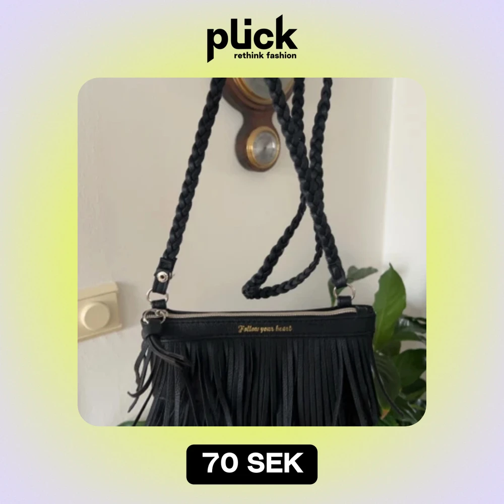 Snygg svart axelväska med flätad axelrem och coola fransdetaljer. Väskan har en dragkedja upptill och texten 'Follow your heart' i guld. Perfekt för en dag på stan eller en kväll ute. 🖤