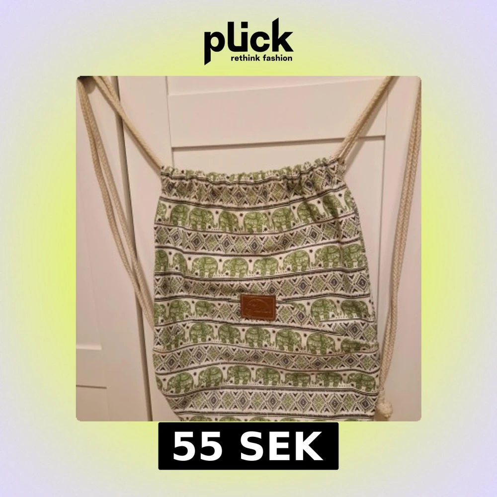 Snygg tygryggsäck med grönt elefantmönster och etniska detaljer på vit botten. Dragskostängning med grova rep och en brun läderpatch framtill. Perfekt för dig som gillar unika accessoarer med boho-vibe.