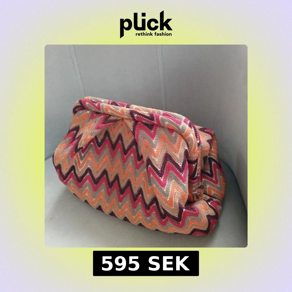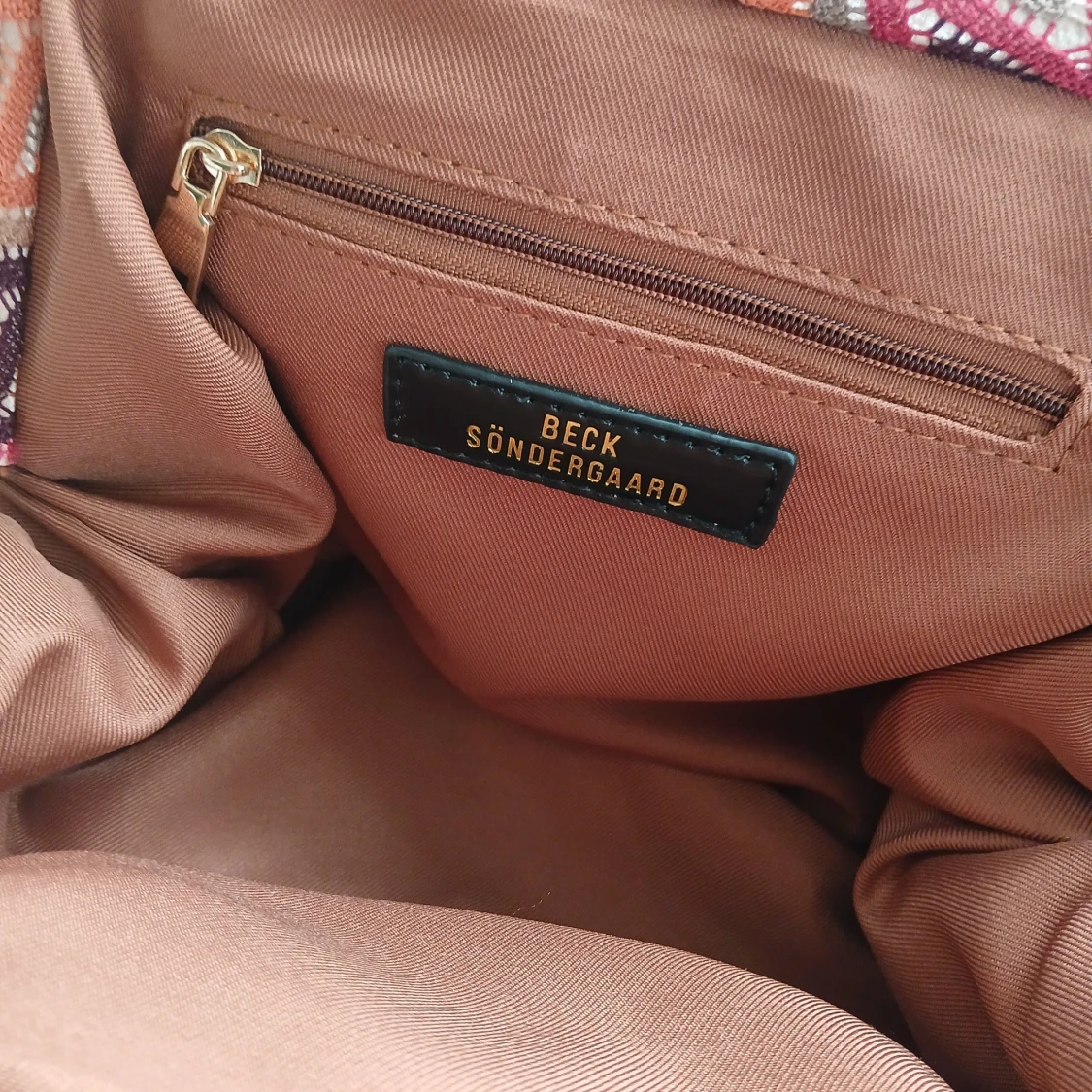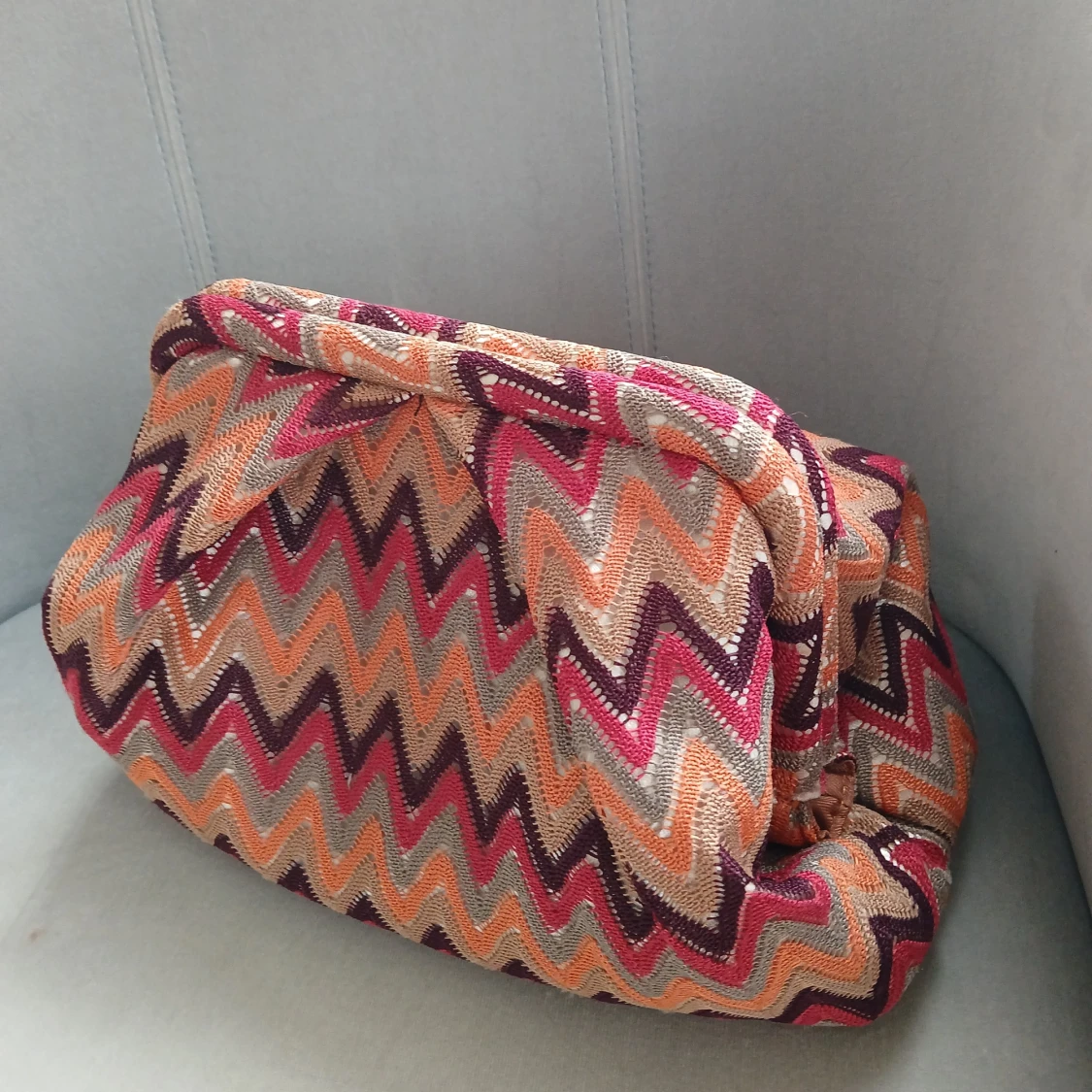 Färgstark kuvertväska från Beck Söndergaard med zigzag-mönster i orange, rosa, beige och vinrött. Väskan är tillverkad i textil och har ett innerfack med dragkedja. Perfekt för dig som vill sticka ut med en unik accessoar.
