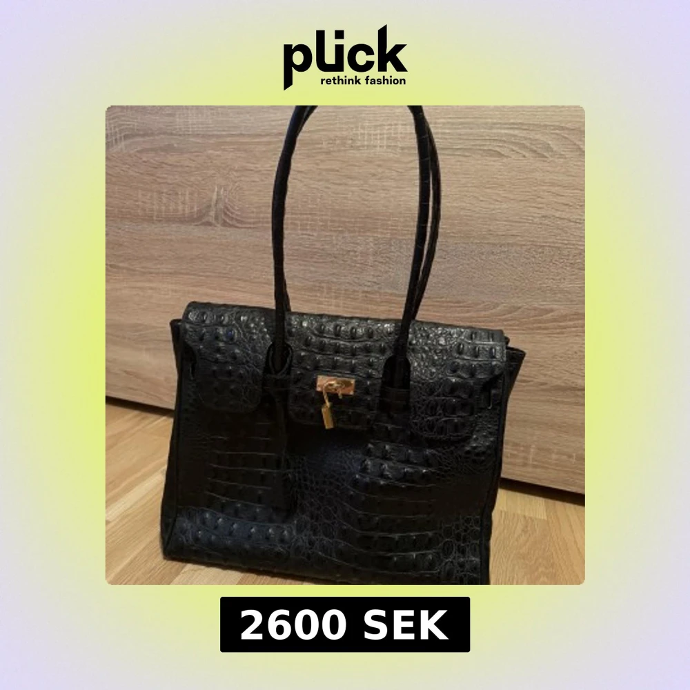 Elegant svart handväska med krokodilpräglat mönster och guldfärgad låsdetalj. Väskan har två handtag och en stilren design som passar perfekt för en chic look.