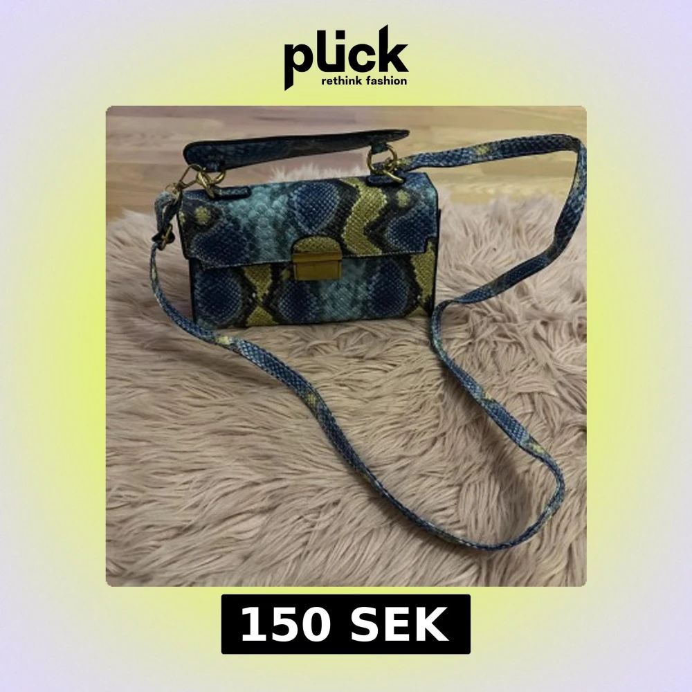 Snygg axelväska med ormmönster i blått och gult. Väskan har en justerbar axelrem och ett praktiskt spänne i guld. Perfekt för att ge din outfit en trendig touch.