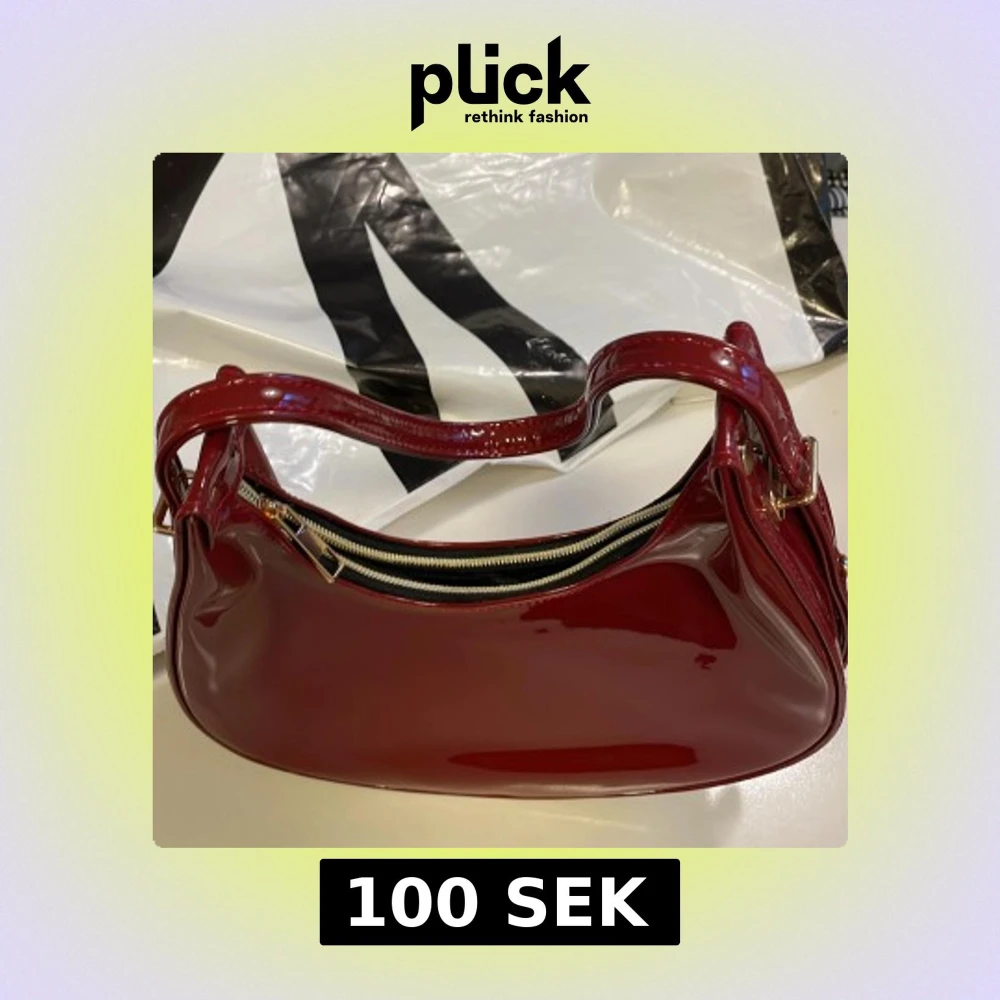 Snygg röd axelväska med glansig finish och guldfärgade detaljer. Väskan har en böjd form, dragkedja upptill och matchande handtag. Perfekt storlek för det viktigaste och ger en cool touch till din outfit. Köptes i Spanien men aldrig använts.