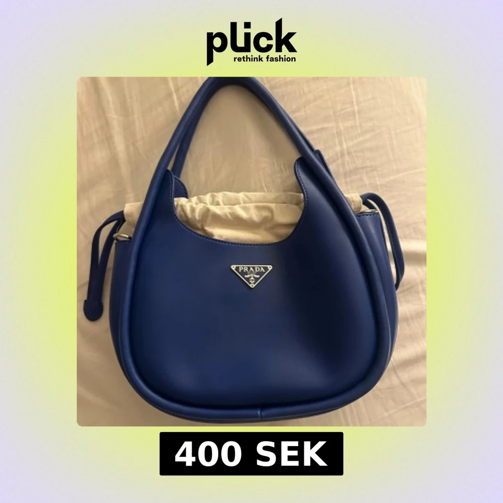 Snygg blå handväska med rundad form och silverfärgad logga framtill. Väskan har både handtag och avtagbar axelrem, samt en beige innerpåse med snörning. Perfekt för dig som vill ha en stilren och lyxig accessoar. Aldrig använd.