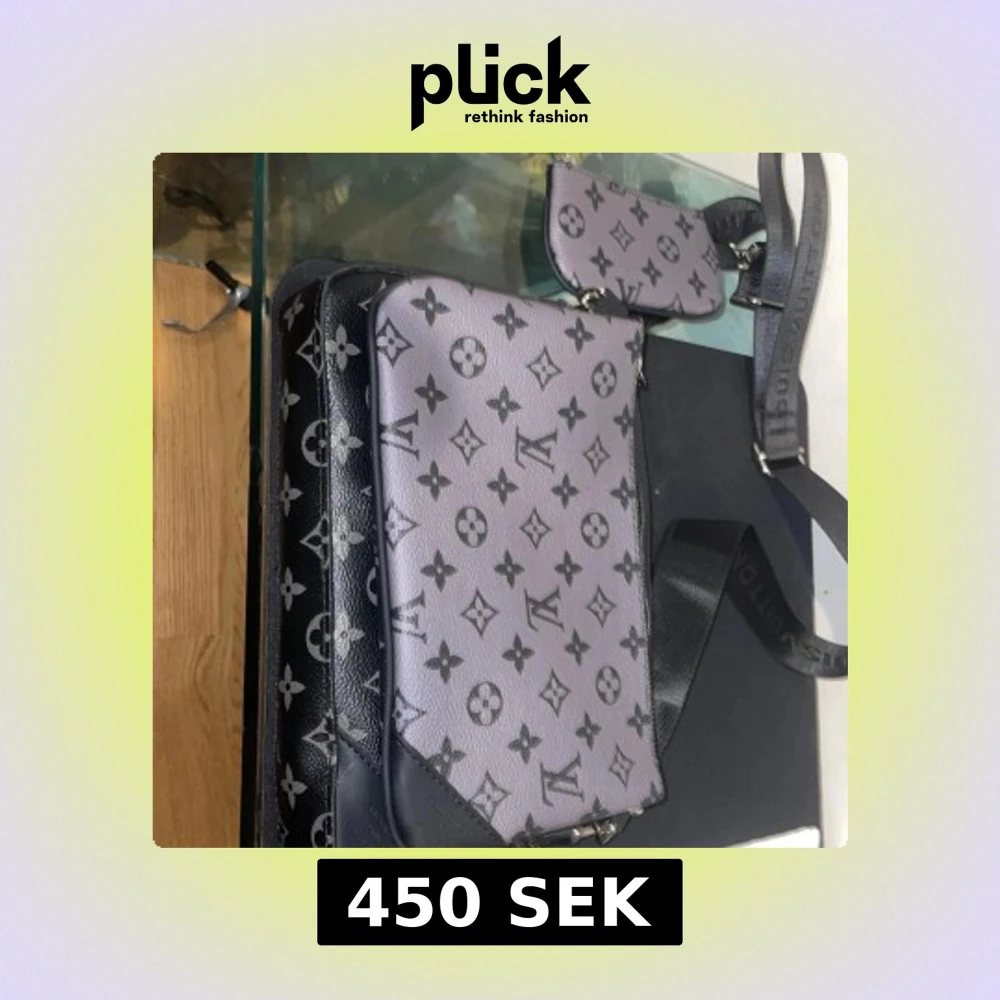 Säljer en snygg axelväska i svart och grått med klassiskt monogrammönster. Väskan har justerbar axelrem, flera fack och en mindre avtagbar väska. Tillverkad i skinn med silverfärgade detaljer och dragkedja. Perfekt för dig som vill ha en stilren och lyxig look.