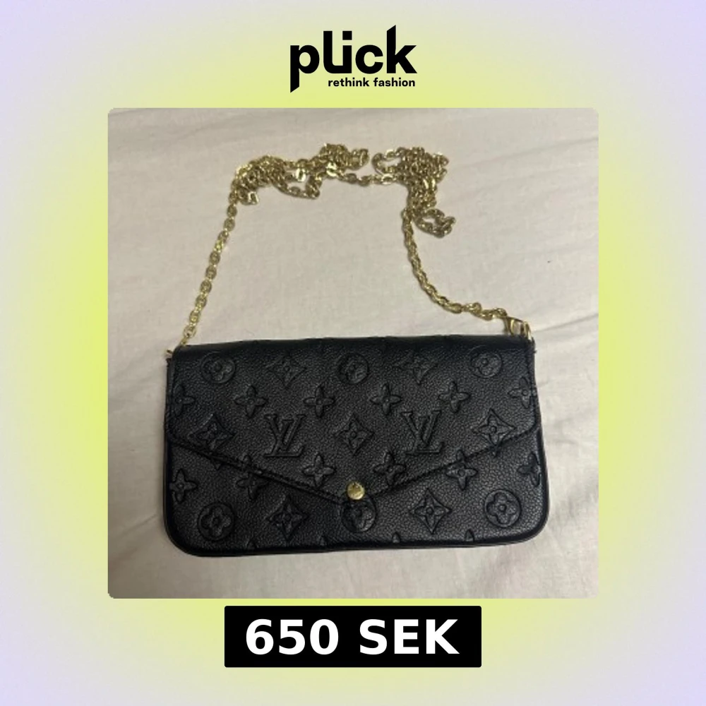 Säljer en svart inte äkta axelväska från med klassiskt monogrammönster. Väskan har guldfärgad kedja och tryckknapp framtill.