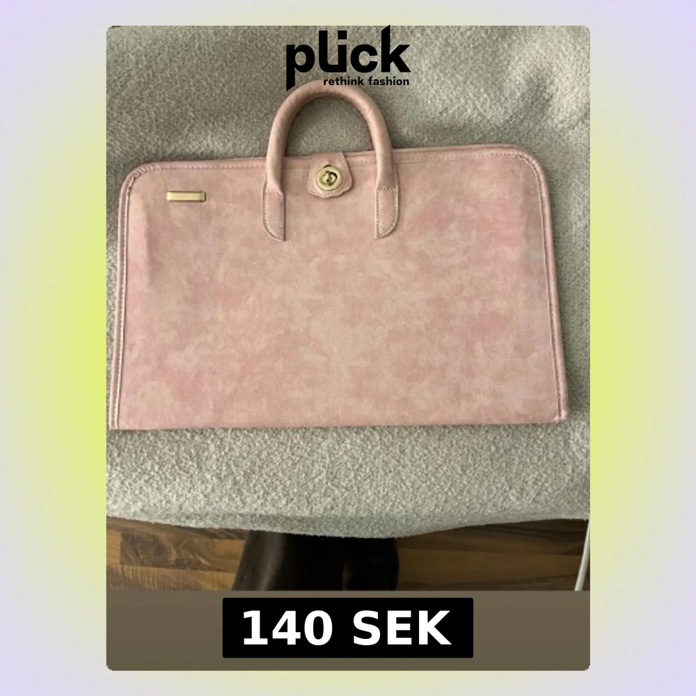 Säljer en stilren ljusrosa datorväska med mjuk mocka-look och guldfärgad detalj framtill. Väskan har två handtag och ett vridlås i guld. Insidan har hörnfickor och små hål för ventilation. Perfekt för laptop eller dokument.