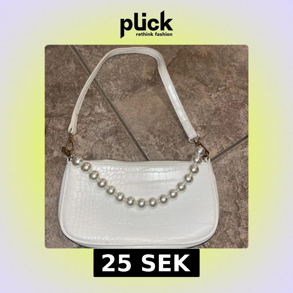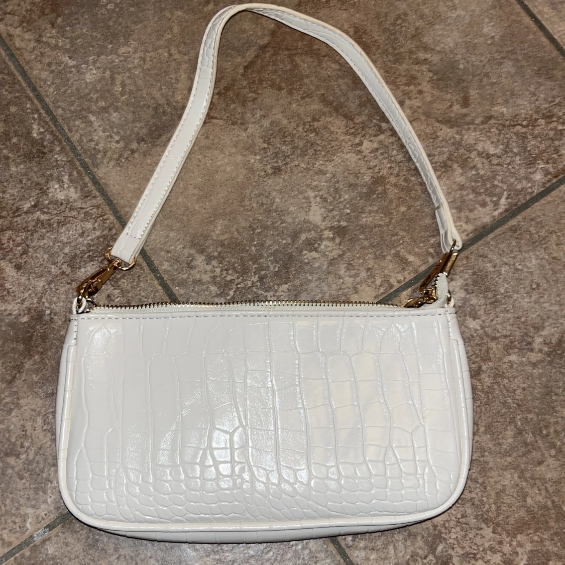 Snygg vit axelväska i croco-mönstrat skinnimitation med guldfärgade detaljer och en avtagbar rem med stora pärlor. Väskan har dragkedja upptill och en stilren, rektangulär form som ger en trendig vibe.