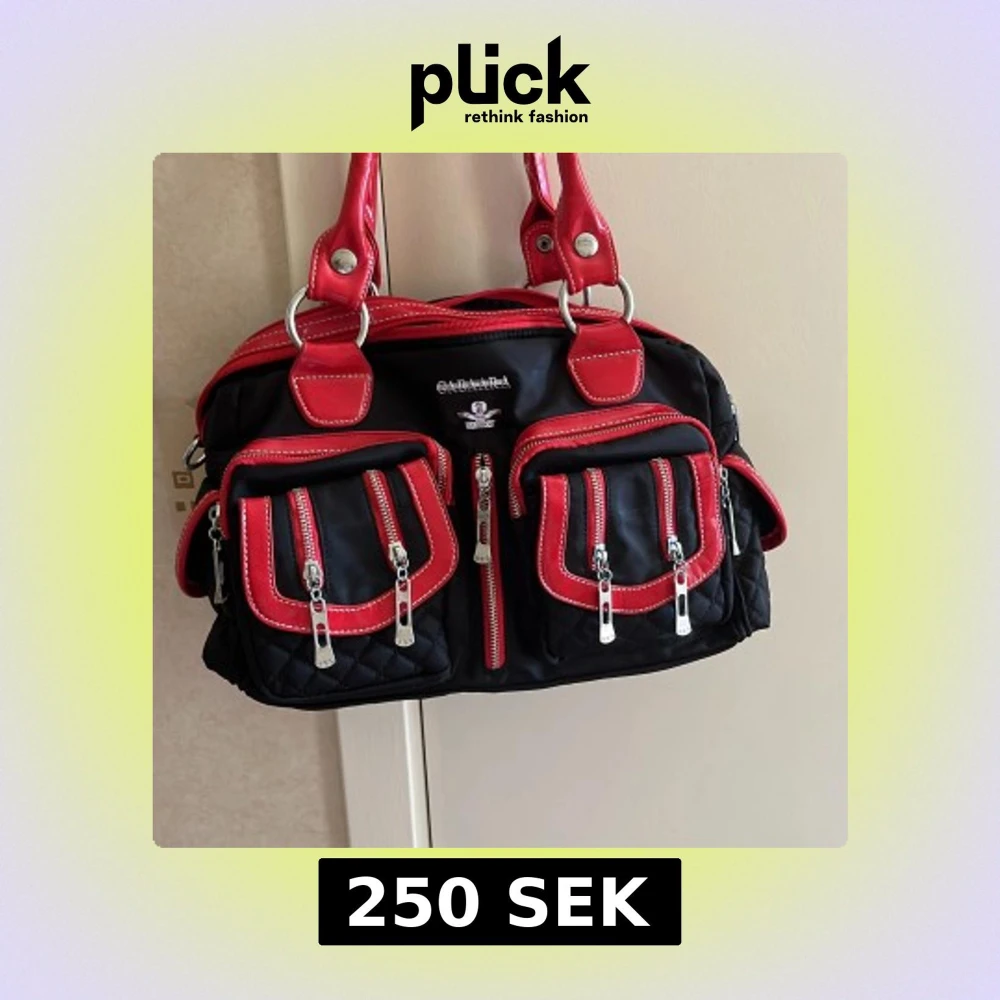 Cool svart axelväska med röda detaljer och flera fickor med dragkedja. Väskan har quiltad botten, silverfärgade metalldelar och breda röda handtag med vita sömmar. Perfekt för dig som gillar att sticka ut med din stil och vill ha plats för allt viktigt.