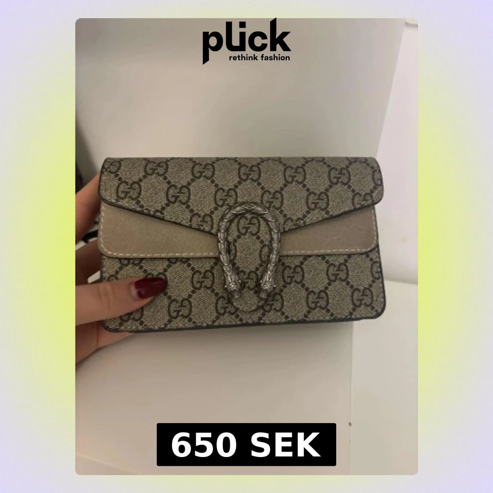 Snygg kuvertväska i beige med klassiskt GG-mönster och silverfärgad kedja. Väskan har en unik metallspänne framtill och detaljer i mocka. Perfekt storlek för det viktigaste och ger en lyxig vibe till din outfit.