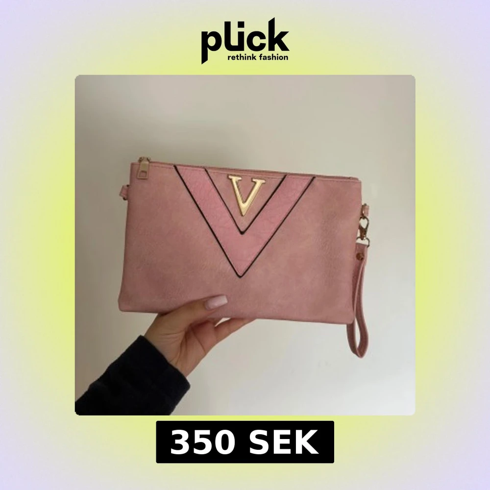 Säljer en snygg rosa axelväska med guldfärgad V-detalj framtill. Väskan har avtagbar axelrem, handledsrem och dragkedja upptill samt ett mindre fack med dragkedja på baksidan. Perfekt storlek för det viktigaste och stilren design.