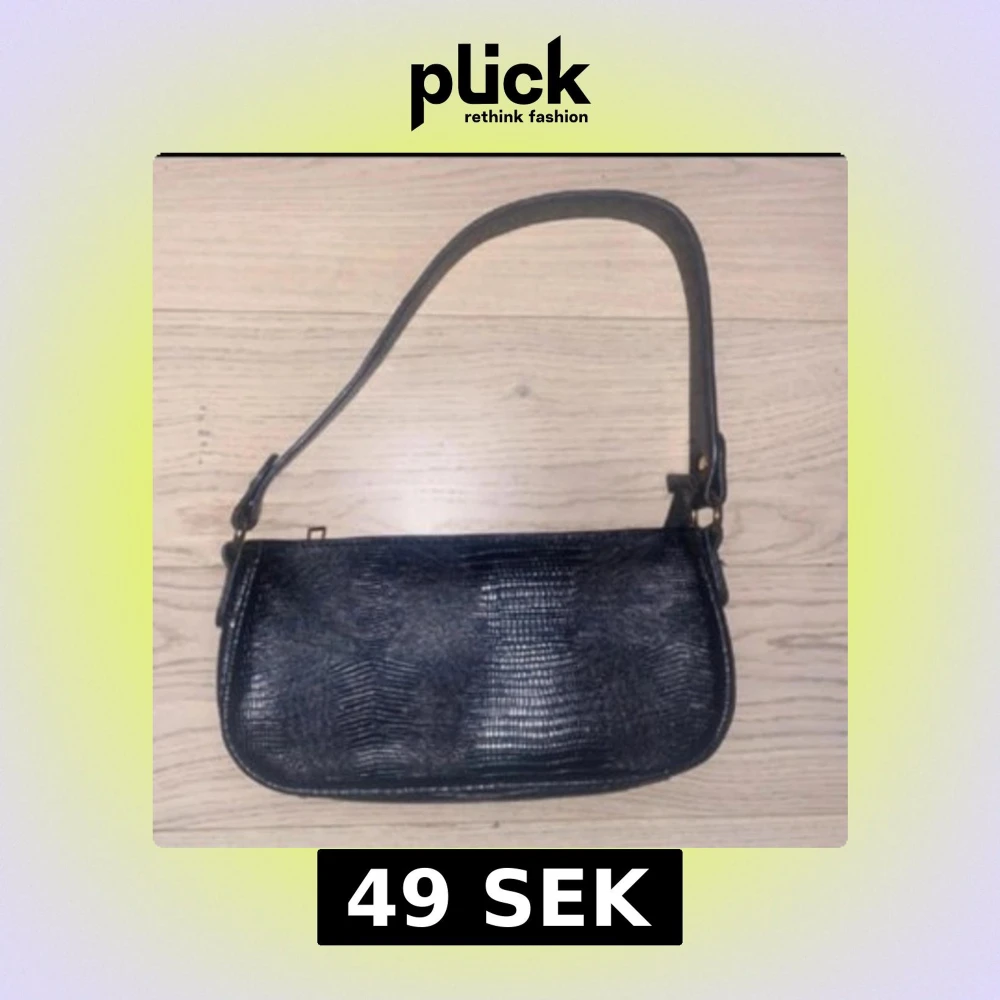 Snygg svart axelväska med stilren form och struktur som påminner om ormskinn. Väskan har ett kort axelband och minimalistisk design, perfekt för att lyfta vilken outfit som helst.
