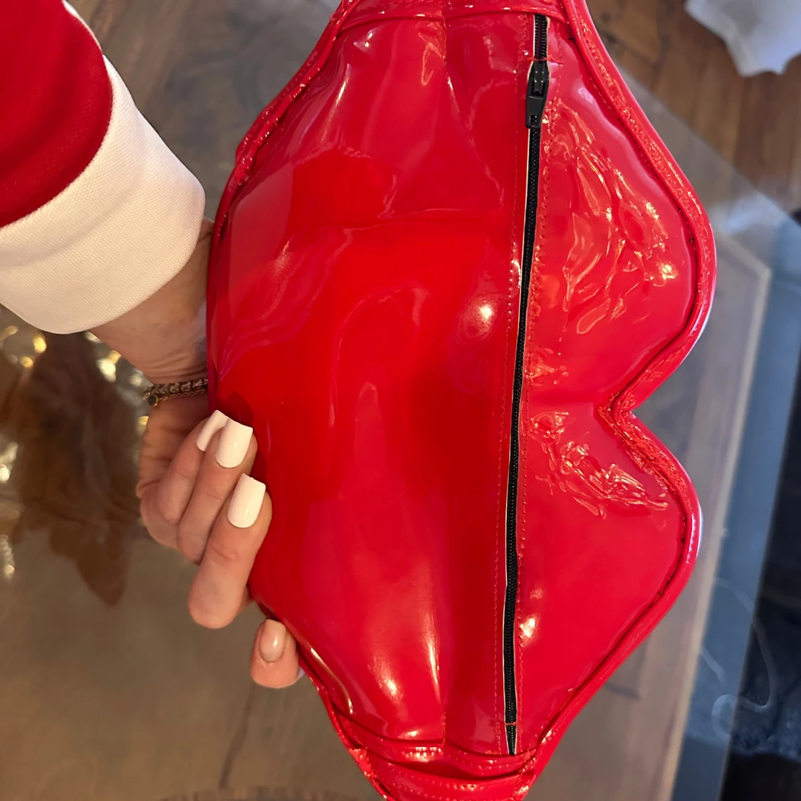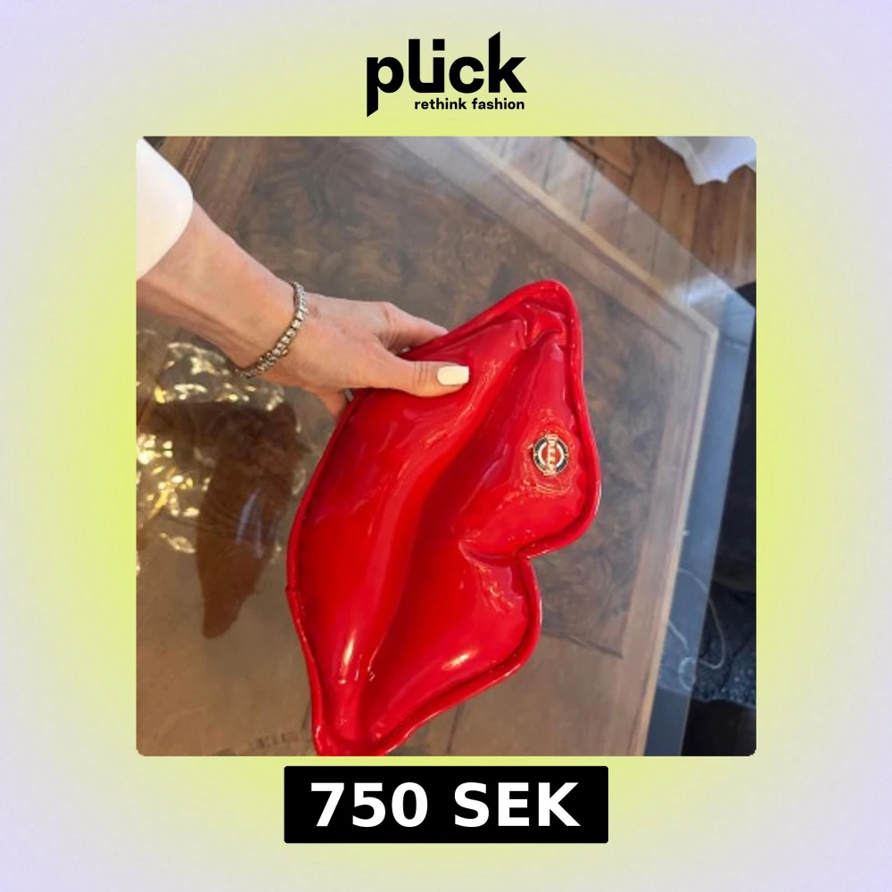 Röd lackväska i form av läppar med en glansig yta. Väskan har en dragkedja på baksidan för enkel öppning och stängning. Perfekt för att ge en färgklick till din outfit.