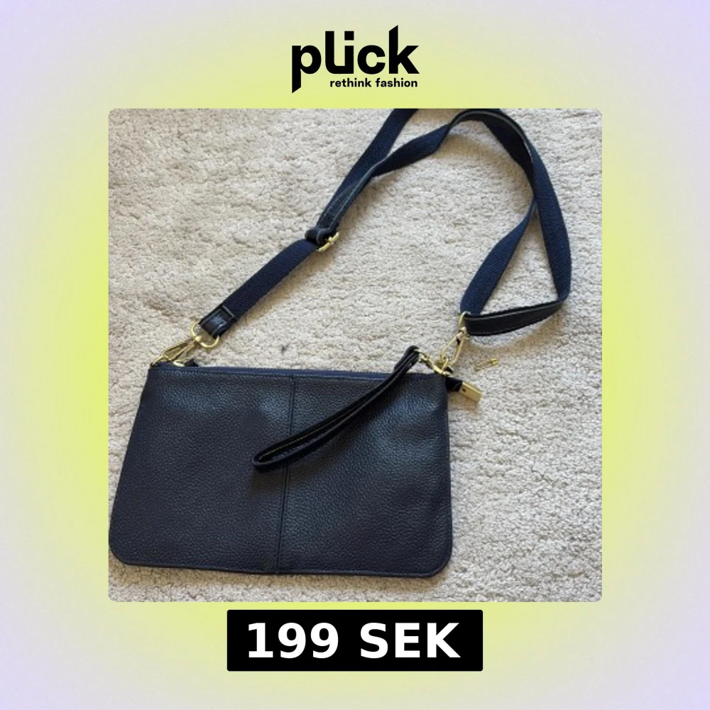 Snygg svart axelväska i äkta skinn med justerbar axelrem och handledsrem. Väskan har guldiga metalldetaljer, dragkedja på baksidan och ett stilrent, minimalistiskt utseende. Perfekt för att bära det viktigaste och passar till många olika outfits.