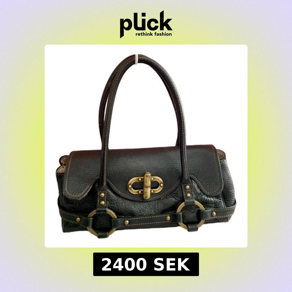 Supersnygg svart väska i äkta läder med gulddetaljer. Insidan är beige och det finns ett litet fack. Några av bilderna är mina och några är tagna från annonsen jag köpte den från. Jag har endast använt den ca 2 gånger. Den är designad av Luella Bartley och tillverkad av Mulberry. Handtagen är långa nog för att kunna ha den över axeln! Det finns några få fläckar inuti och det är lite tecken på användning på metallen, som fanns redan när jag köpte den. Bredd: 34cm, höjd: 14cm, djup: 12cm