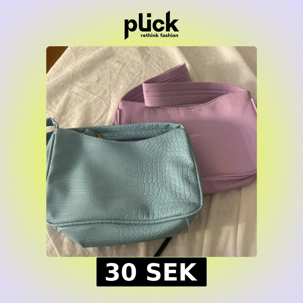 Två snygga axelväskor i pastellfärger. Den ena är ljusblå med croco-mönstrad yta och den andra är lila med slät finish. Båda har enkel, stilren design och bred axelrem. Perfekta för att lyfta din outfit med färg och trendig vibe.
