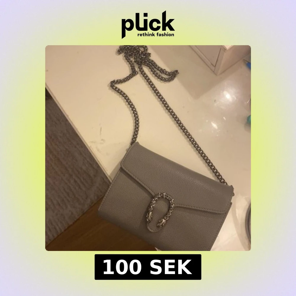 Säljer en stilren grå axelväska i skinn med grov kedjerem och ett snyggt spänne framtill med detaljerade huvuden. Perfekt storlek för det viktigaste och ger en cool vibe till din outfit.