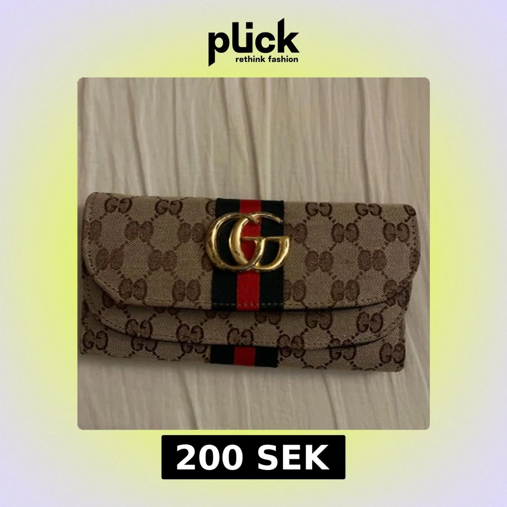 Säljer en beige plånbok med klassiskt GG-mönster, guldfärgad GG-logga och svart/röd rand på framsidan. Perfekt accessoar för dig som gillar lyxiga detaljer och tidlös design.