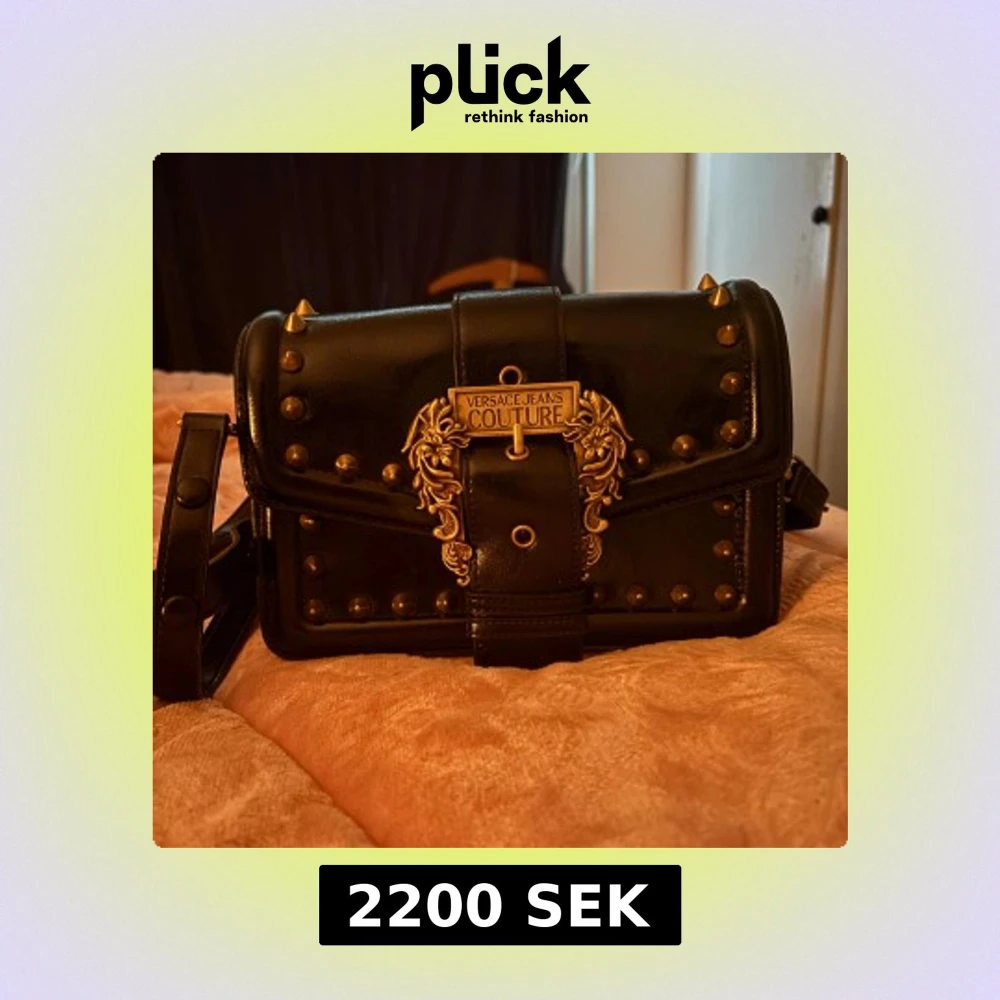 Säljer en svart axelväska från Versace Jeans Couture i skinn med guldiga nitar och detaljer. Väskan har en dekorativ spänne framtill med Versace-logga och coola guldfärgade drakmotiv. Justerbar axelrem och hård, boxig form. Perfekt för dig som gillar statement-accessoarer.