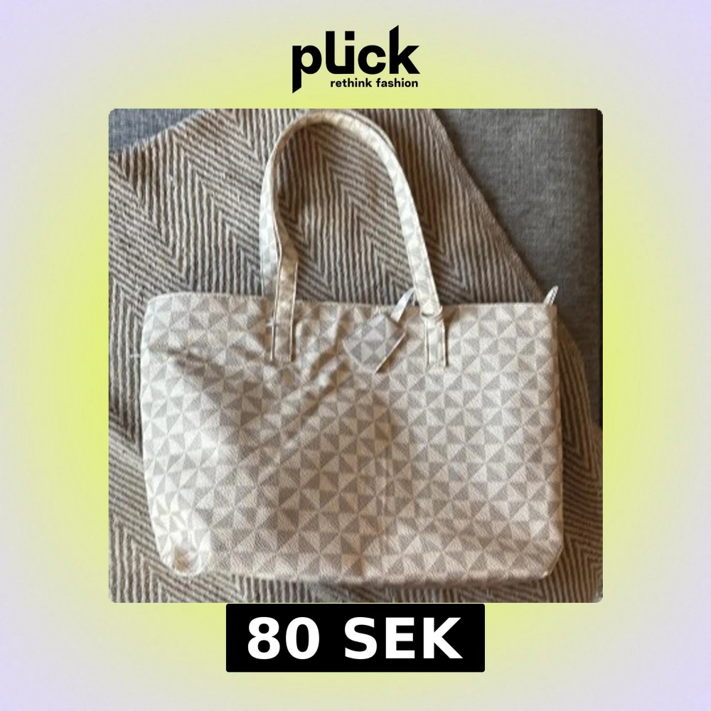 Stor och rymlig shoppingväska i beige tyg med geometriskt mönster. Väskan har två långa handtag och ett stort huvudfack med innerficka som stängs med dragkedja. Perfekt för att bära med sig allt man behöver under dagen.