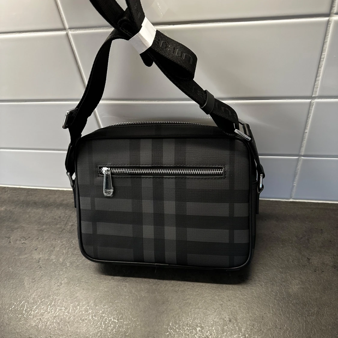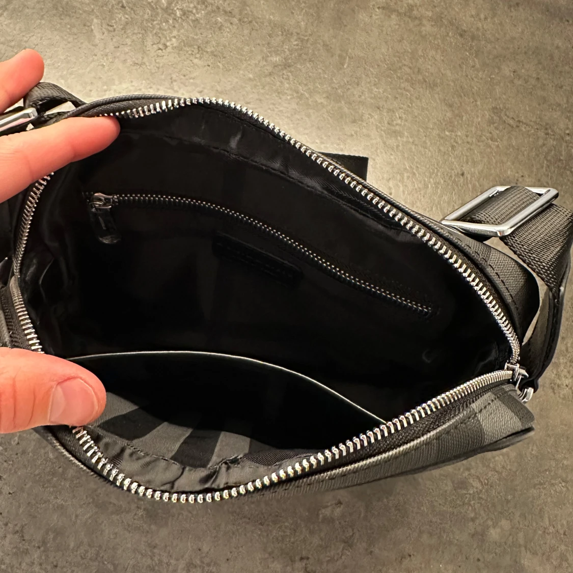 Snygg svart axelväska med diskret rutigt mönster och justerbar axelrem. Väskan har dragkedja upptill, ett ytterfack med dragkedja och flera innerfack för enkel organisering. Perfekt för att bära det viktigaste i vardagen.