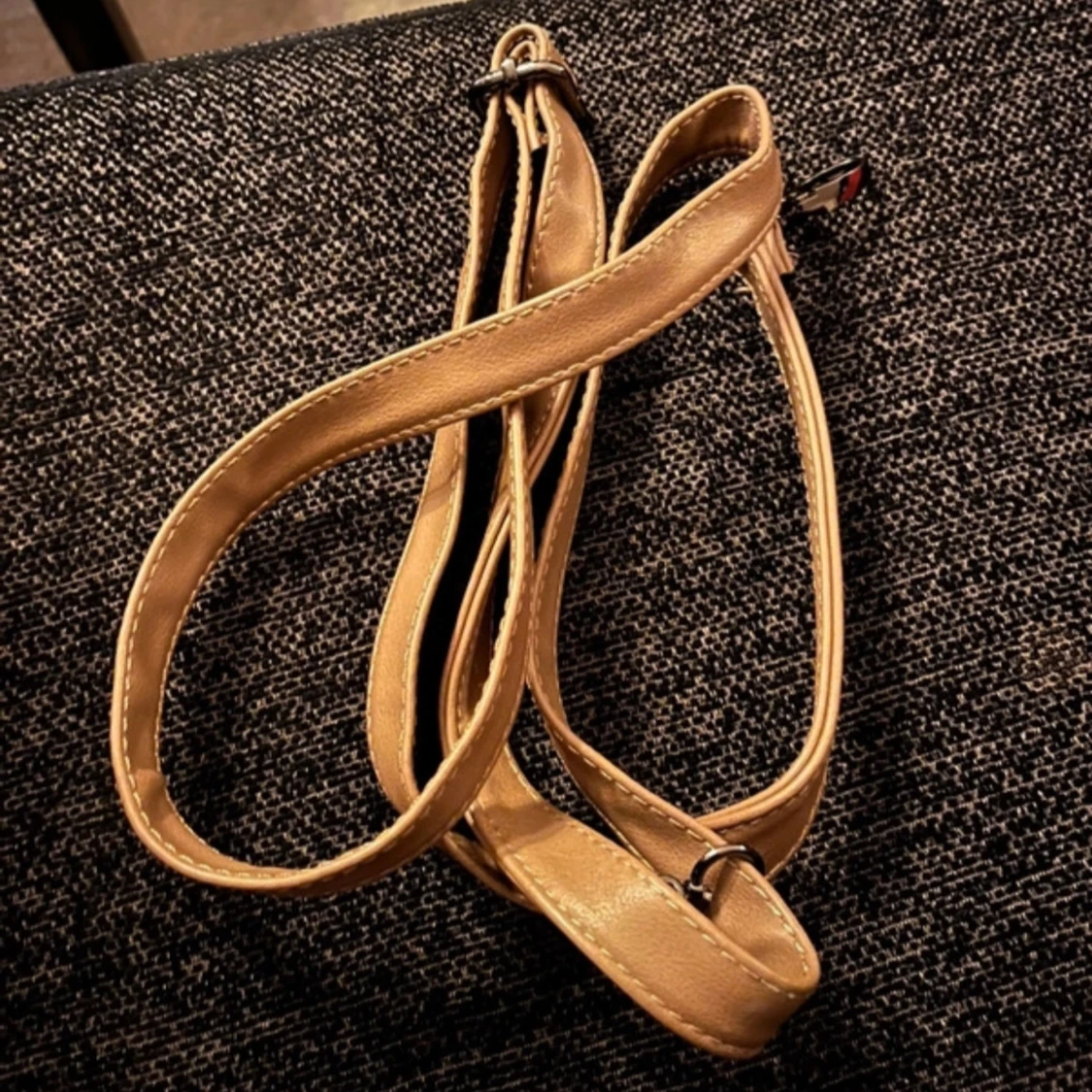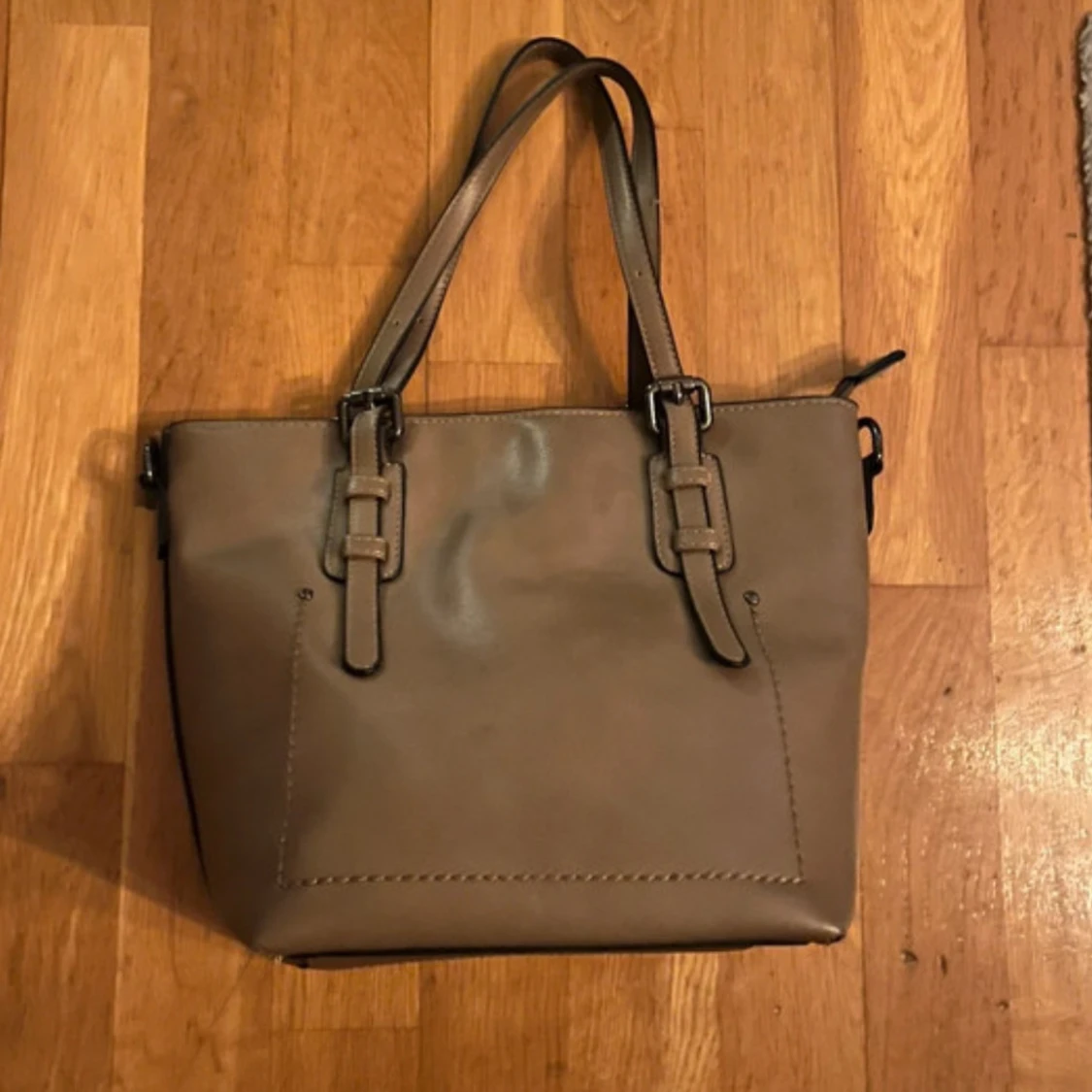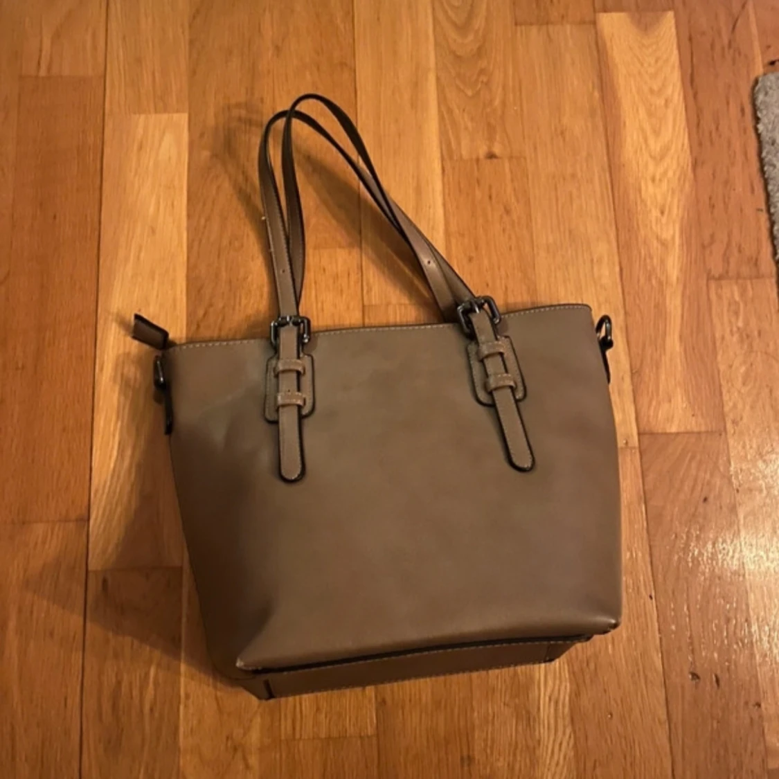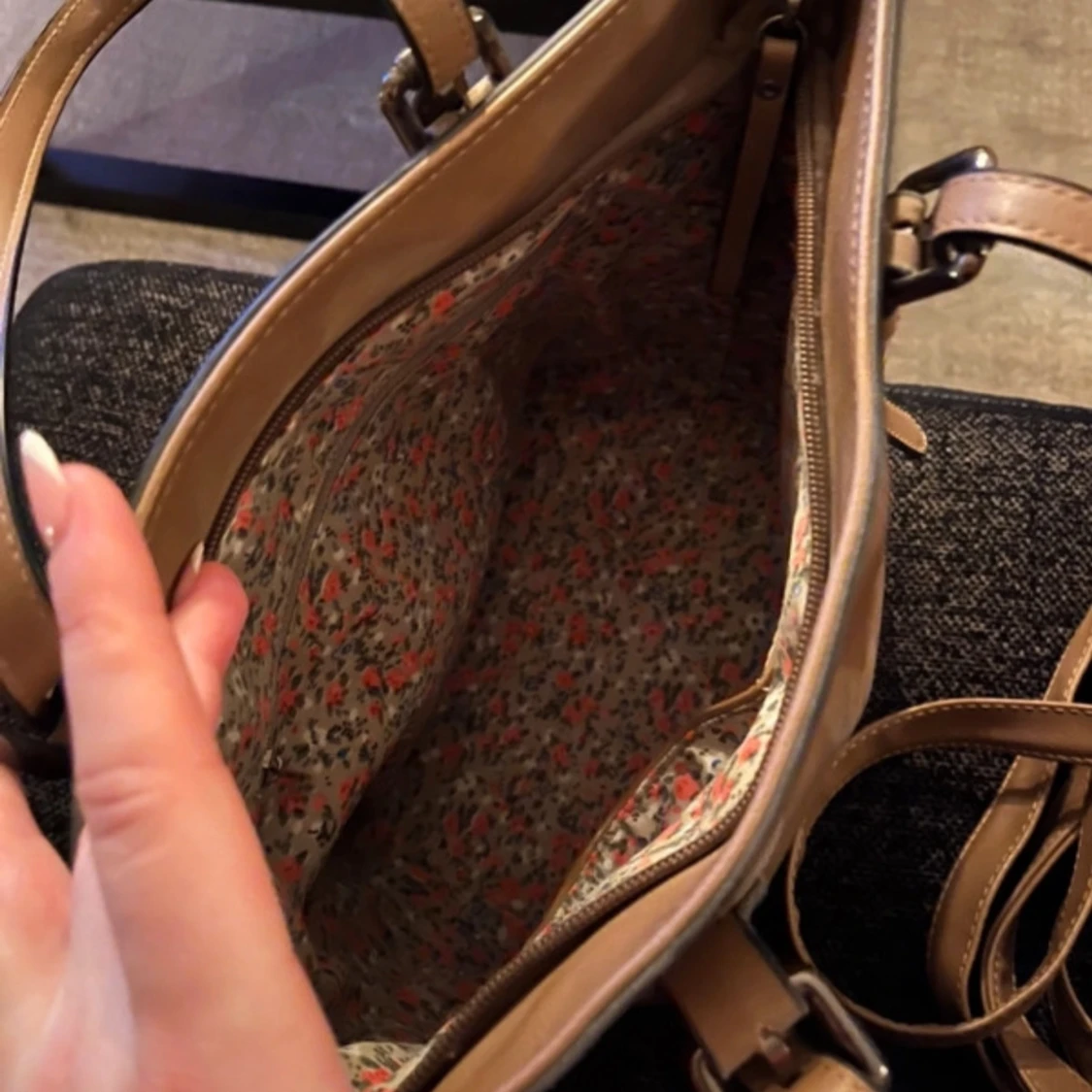 Snygg beige axelväska med justerbara remmar och blommigt foder. Väskan har en dragkedja för säker förvaring och är perfekt för att bära dina dagliga nödvändigheter.