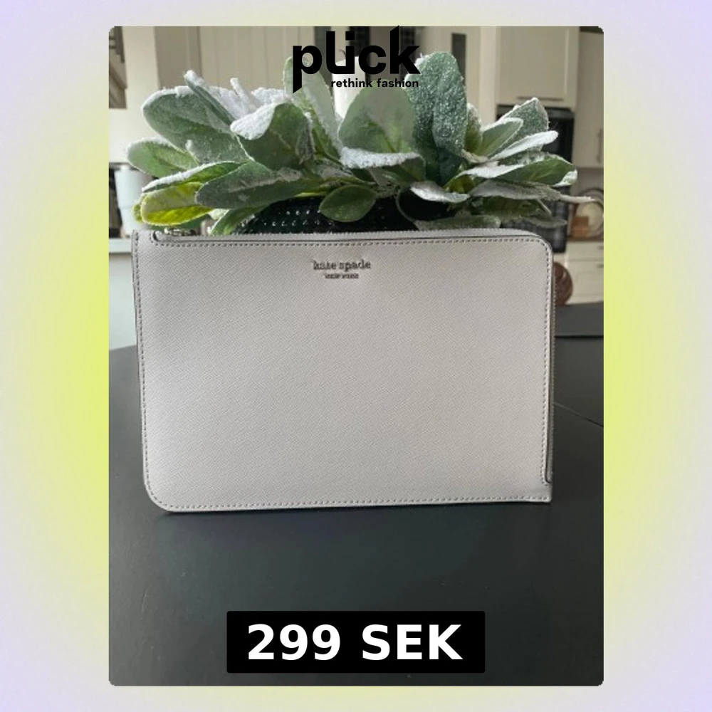 Snygg grå kuvertväska från Kate Spade i skinn med stilren design och silverfärgad logga. Väskan har handledsrem, dragkedja och ett fack på baksidan. Insidan är ljus med hjärtmönster och har kortfack. Perfekt för essentials och enkel att bära med sig.