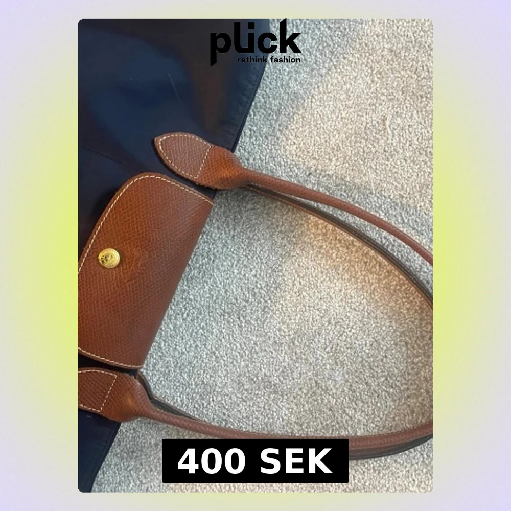 Säljer en klassisk marinblå axelväska från Longchamp med bruna skinnhandtag och detaljer. Väskan har guldfärgade metalldetaljer och dragkedja. Perfekt storlek för att få plats med allt du behöver och enkel att bära över axeln.