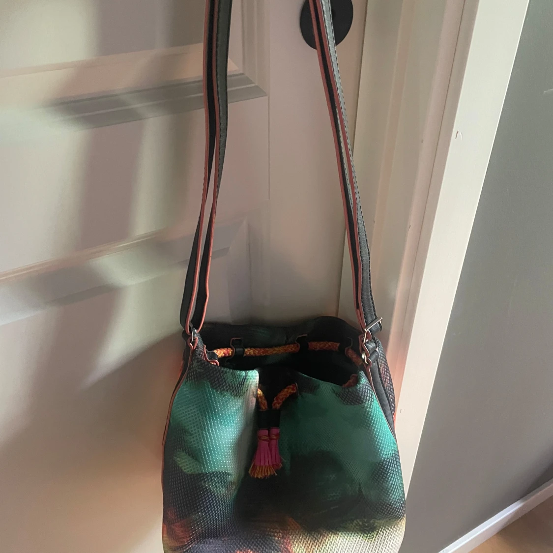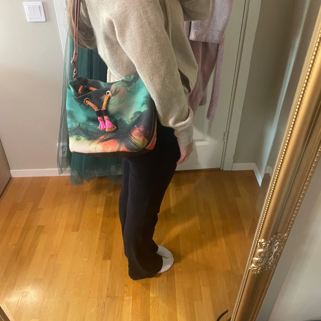 Säljer en unik axelväska i syntetmaterial med coolt färgskiftande mönster i grönt, orange och rosa. Väskan har snörning upptill med färgglada detaljer och en bred axelrem med kontrastkant. Perfekt för dig som vill sticka ut med din stil.