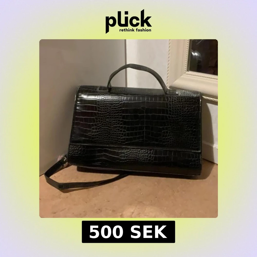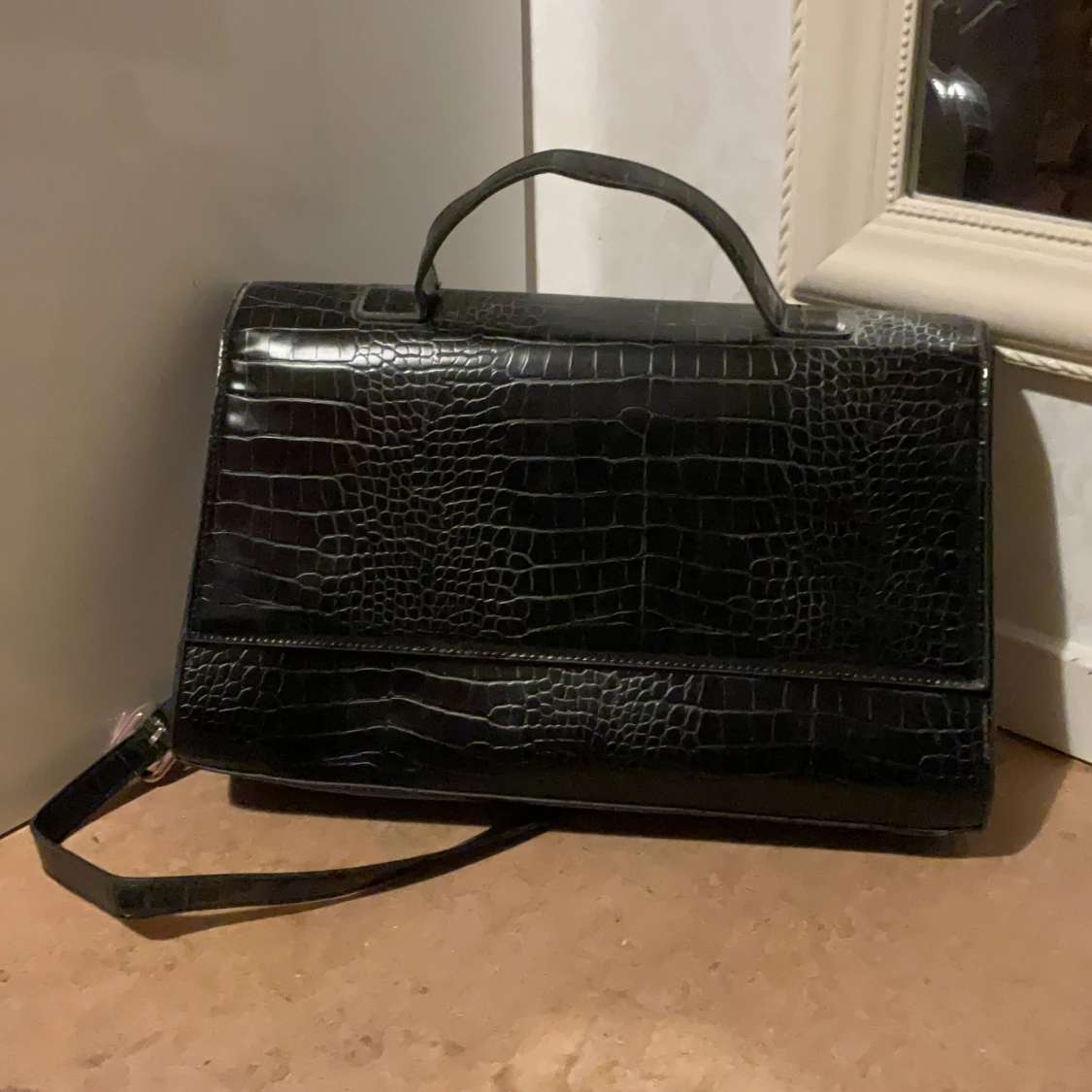 Stilren svart axelväska med krokodilpräglat mönster och både handtag och axelrem. Väskan har en klassisk, fyrkantig form och är tillverkad i glansigt skinnliknande material. Perfekt för dig som vill ha en elegant och trendig accessoar.
