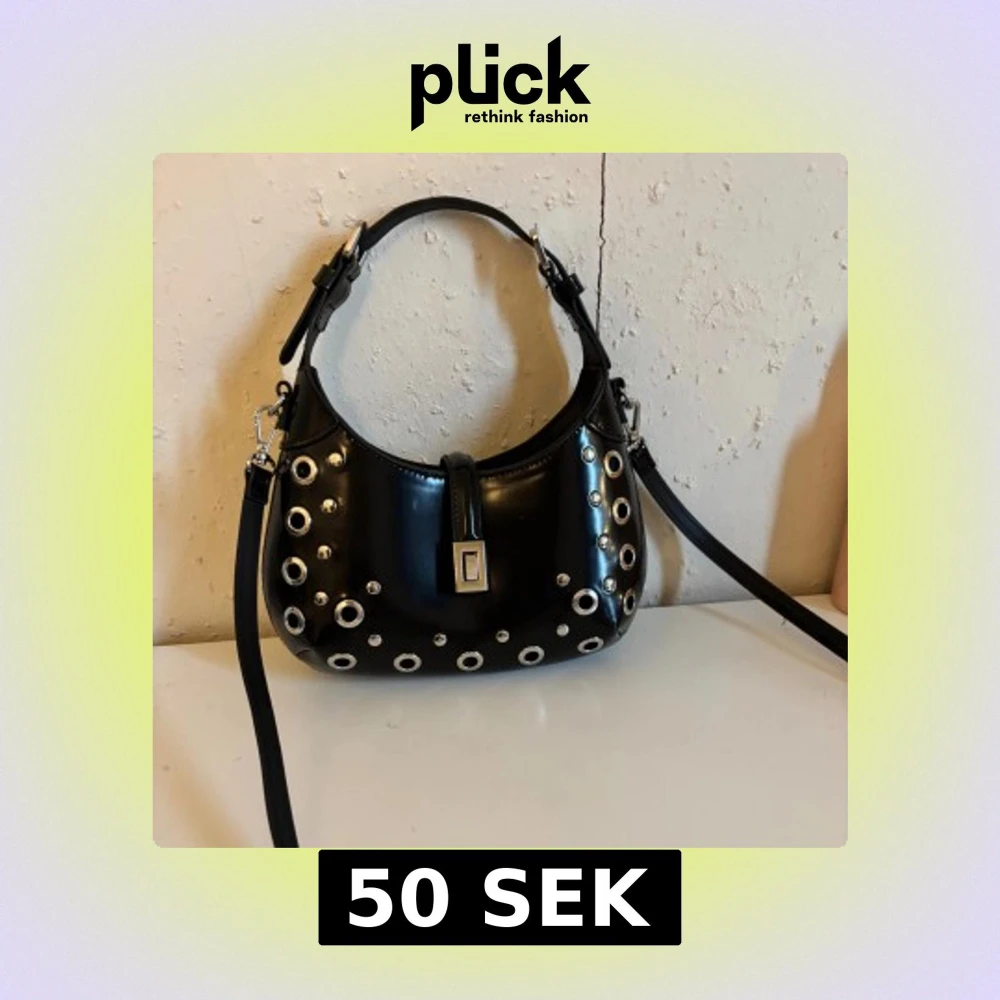 Cool svart axelväska i skinn med massor av silvriga metalldetaljer och öglor på framsidan. Väskan har justerbart axelband och ett snyggt spänne framtill. Perfekt för dig som vill sticka ut med en edgy accessoar.
