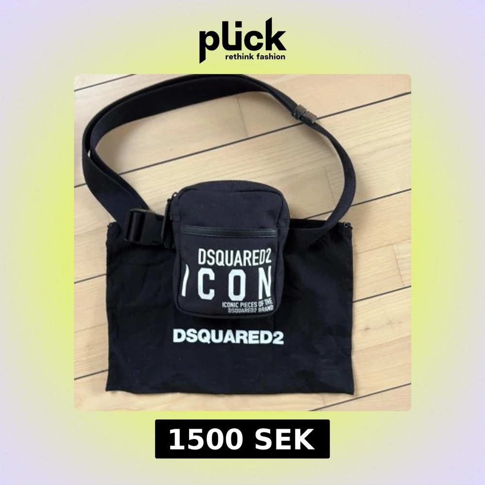 Säljer en svart axelväska från DSQUARED2 med tydlig logga och texten ICON på framsidan. Väskan har justerbart band och dragkedja upptill. Perfekt för att bära det viktigaste och har en modern streetstyle-look. Du får även till en påse till väskan.