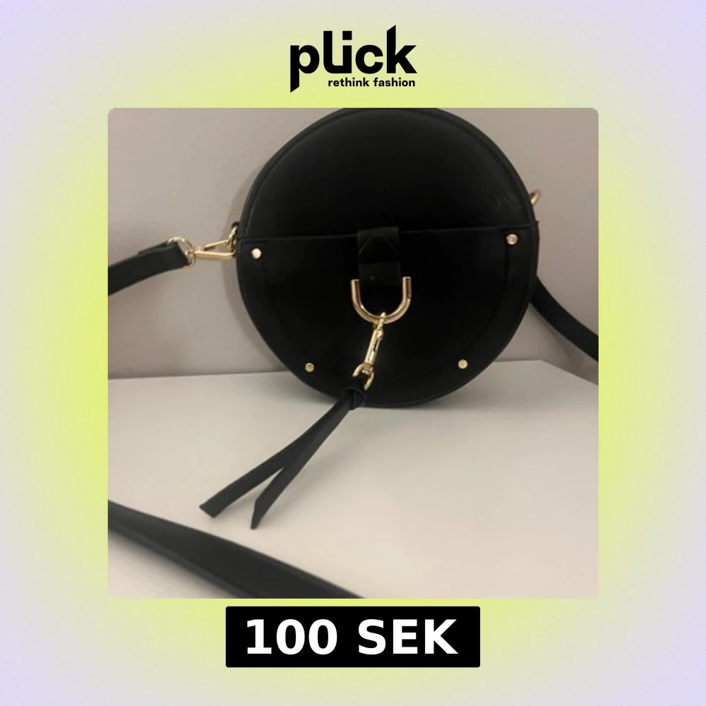 Säljer en rund svart axelväska i skinnimitation med guldfärgade metalldetaljer och dekorativ ring framtill. Väskan har en lång axelrem och en ficka på baksidan. Perfekt för att bära det viktigaste med stil.