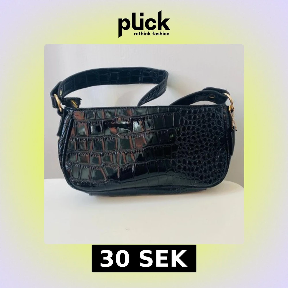 Snygg svart axelväska från SHEIN med glansig croco-imitation och guldfärgade detaljer. Väskan har en bred axelrem och dragkedja upptill. Perfekt för att lyfta din outfit med en trendig touch.