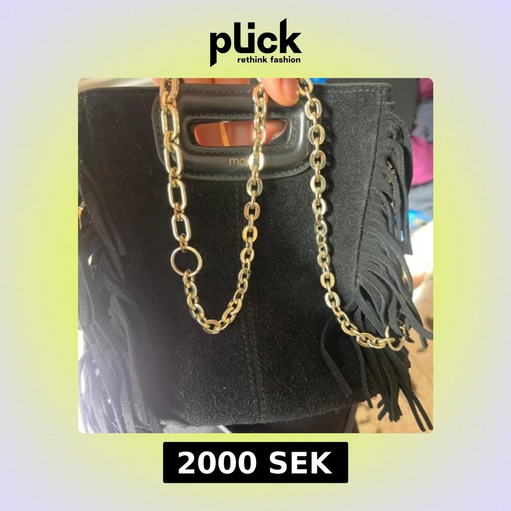 Säljer en svart axelväska från Maje i mocka med dekorativa fransar på sidorna och en snygg kedjerem i guld. Väskan har ett stilrent handtag upptill och är perfekt för att lyfta din outfit. Priset kan 100 % diskuteras