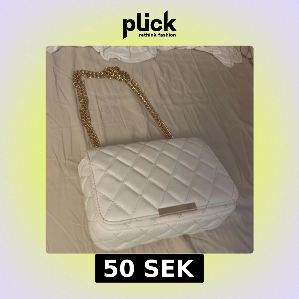 Snygg vit axelväska med quiltat mönster och guldfärgad kedja som axelrem. Väskan har en stilren rektangulär form och stängs med ett metallspänne framtill. Perfekt för dig som vill ha en trendig och elegant accessoar.