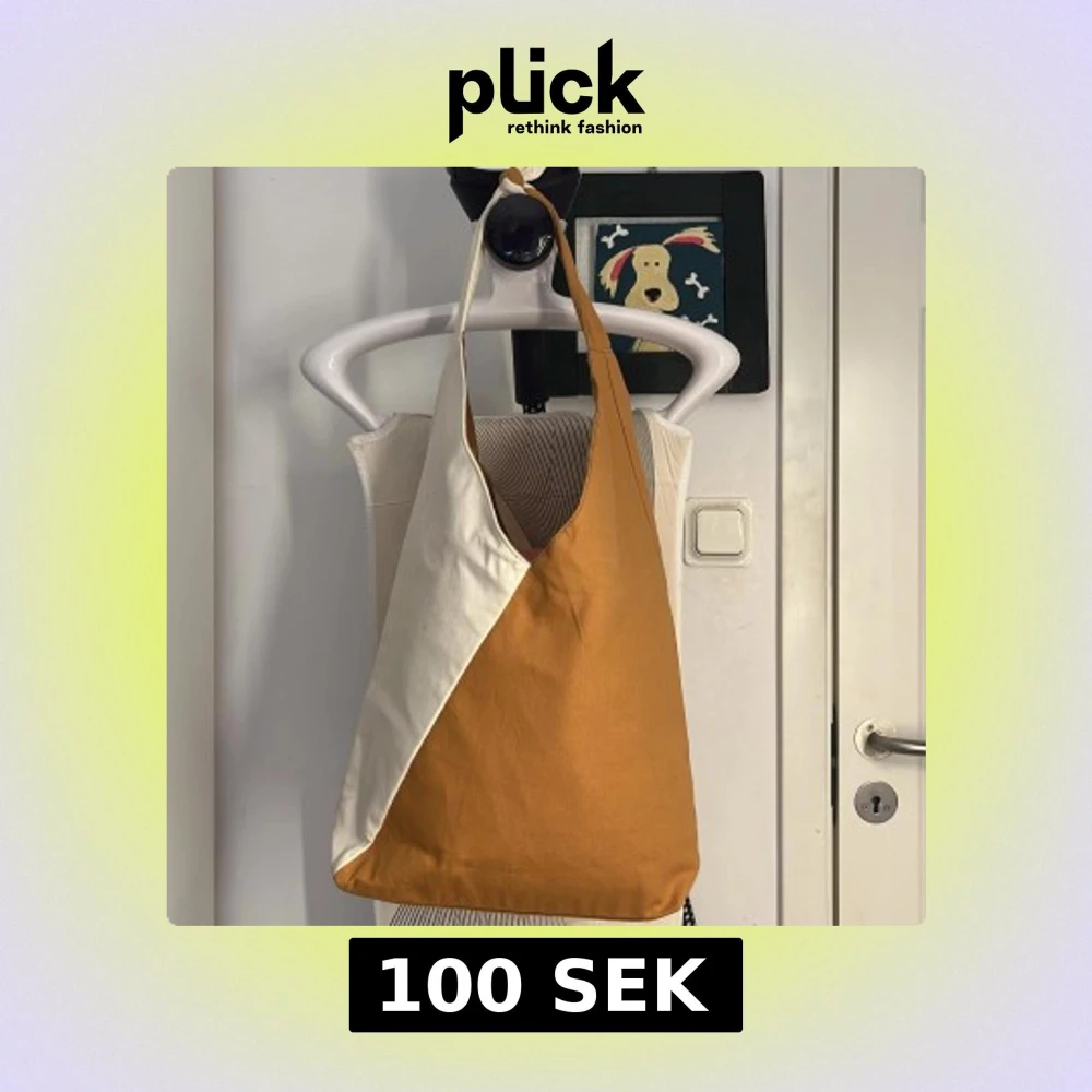 Säljer en stor och rymlig tygväska i beige och orange. Väskan har en enkel och stilren design med bred axelrem och är perfekt för att bära med sig allt man behöver under dagen. Passar lika bra till skolan som till stan.