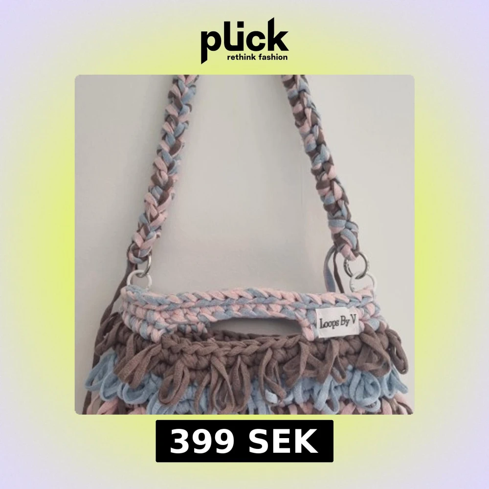 Unik axelväska från Loops By V virkad i dubbelt bandgarn av återvunnen bomull. En härlig mix av rosa, blå och brun. Avtagbar axelrem. Perfekt för att ge din outfit en bohemisk touch. Mått L ca 25cm B ca 7cm H ca 22cm med handtag.