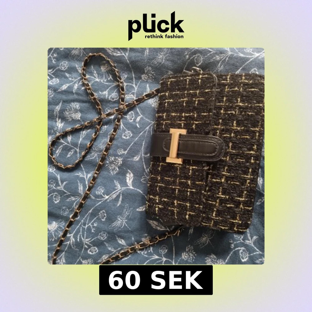 Snygg axelväska i svart och guld med rutigt mönster och grov textur. Väskan har en kedja med inslag av svart läder och ett elegant spänne i guld på framsidan. Perfekt storlek för mobilen och det viktigaste. Materialet är troligtvis syntet och skinn.