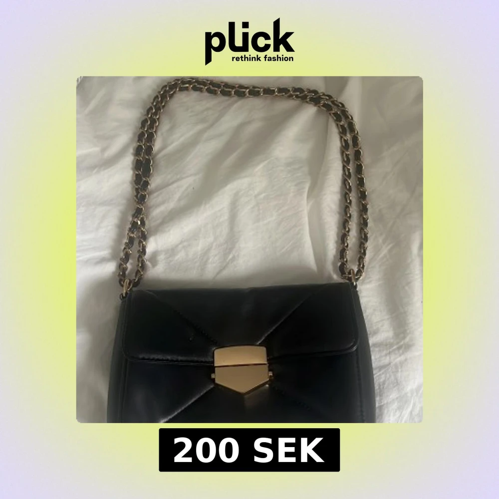 Snygg svart axelväska med mjukt skinnmaterial och guldfärgad kedja som axelrem. Väskan har ett geometriskt lock med ett coolt guldspänne framtill och en praktisk dragkedja på baksidan. Perfekt storlek för mobil, plånbok och småsaker. Bra skick