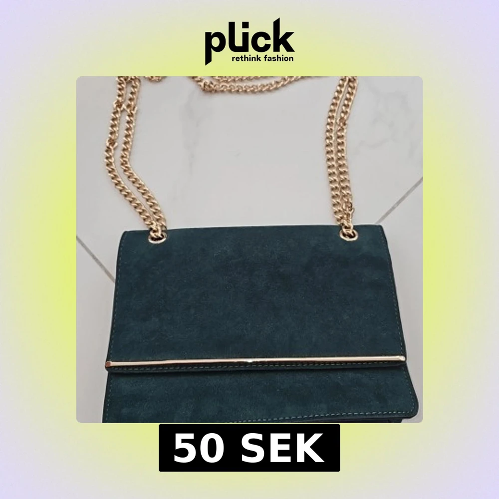 Snygg mörkgrön axelväska från New Look i mjuk mocka med guldfärgad kedja och metall-detalj på locket. Perfekt storlek för mobilen och det viktigaste. Magnetlås och ett fack på insidan. Stilren och trendig design som lyfter din outfit.