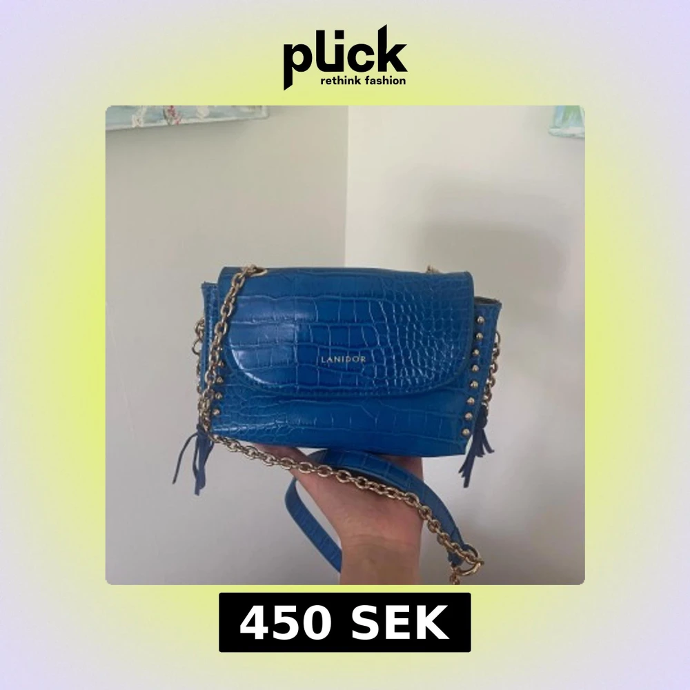 Snygg blå axelväska från Lanidor i croco-mönstrat skinnimitation och dekorativa tofsar. Stängd med ett magnetlås, och insidan har ett fack med dragkedja. Väskan är helt ny men utan prislapp.